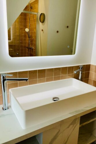 L’intervention comprend également une amélioration globale des performances techniques du bâtiment : isolation renforcée des plafonds, mise aux normes complète de l’installation électrique, remplacement du système de chauffage existant et installation d’une nouvelle ventilation pour optimiser la qualité de l’air et les performances énergétiques de l’ensemble.