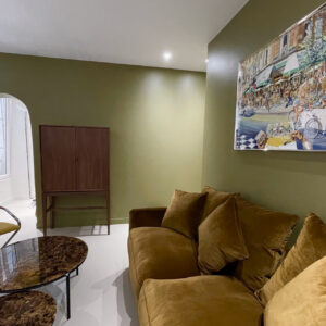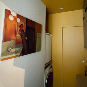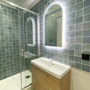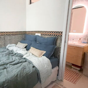 Une nouvelle entrée a été créée depuis l’ancienne chambre, permettant de distribuer le séjour. En contournant le mur porteur, on accède à la cuisine, au fond de laquelle se trouvent les WC, puis à la chambre et à la nouvelle salle de bain. Cette dernière bénéficie d’un apport de lumière naturelle en partie haute, garantissant intimité et confort. L’ensemble forme un parcours fluide et cohérent, optimisé pour tirer le meilleur parti de la surface disponible.