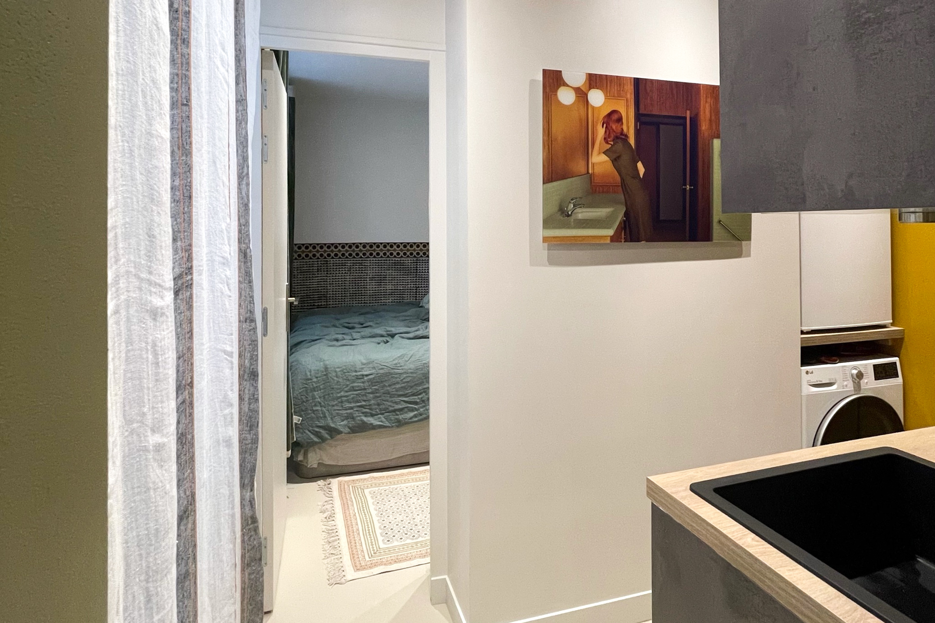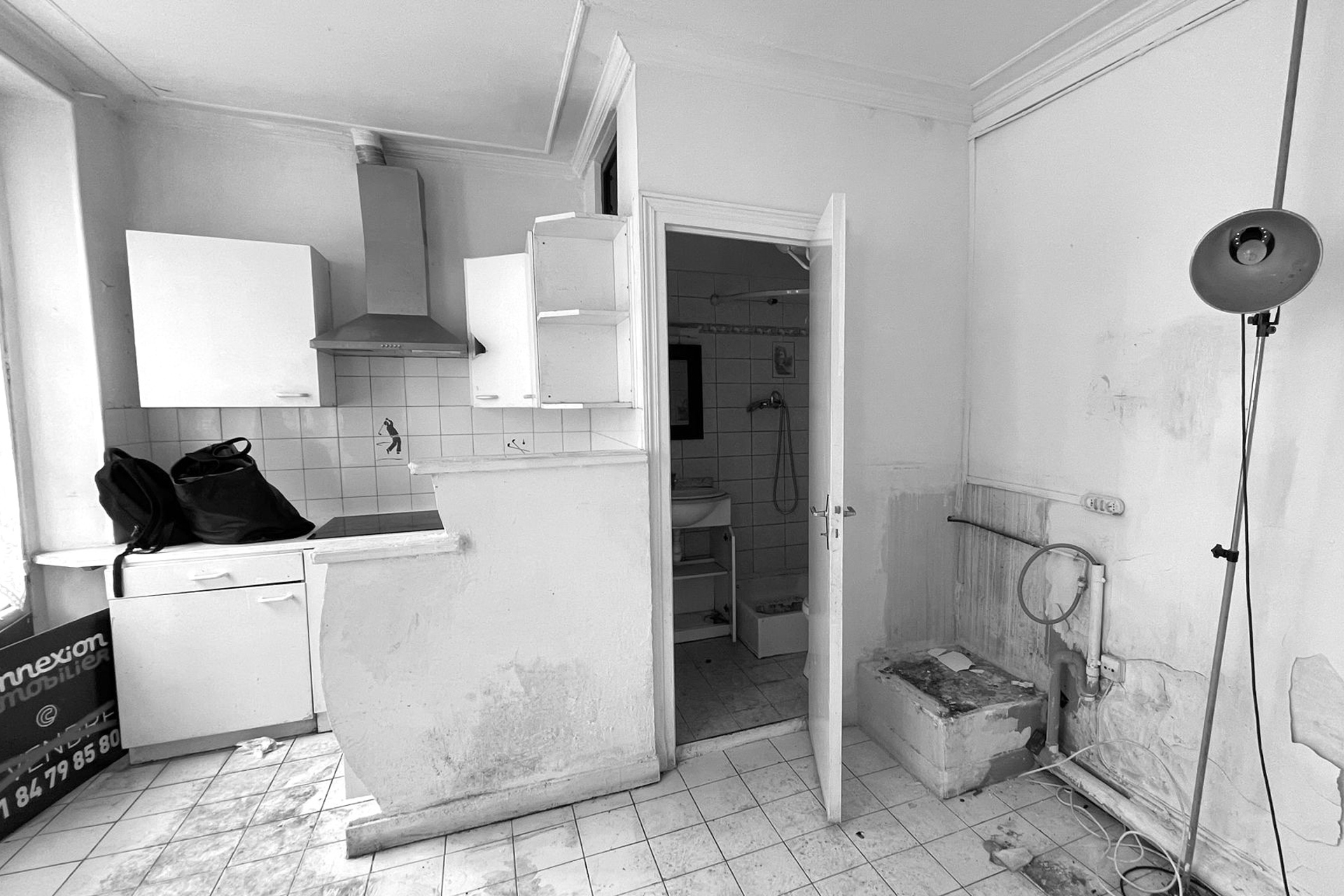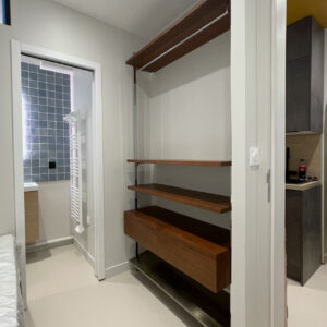 À l’origine, l’entrée débouchait directement sur la cuisine et une salle d’eau avec WC, tandis que la chambre occupait la plus grande surface. La contrainte structurelle du mur séparatif des deux anciens logements s’est alors imposée comme le fil conducteur du projet : intouchable, il organise désormais l’ensemble des circulations.