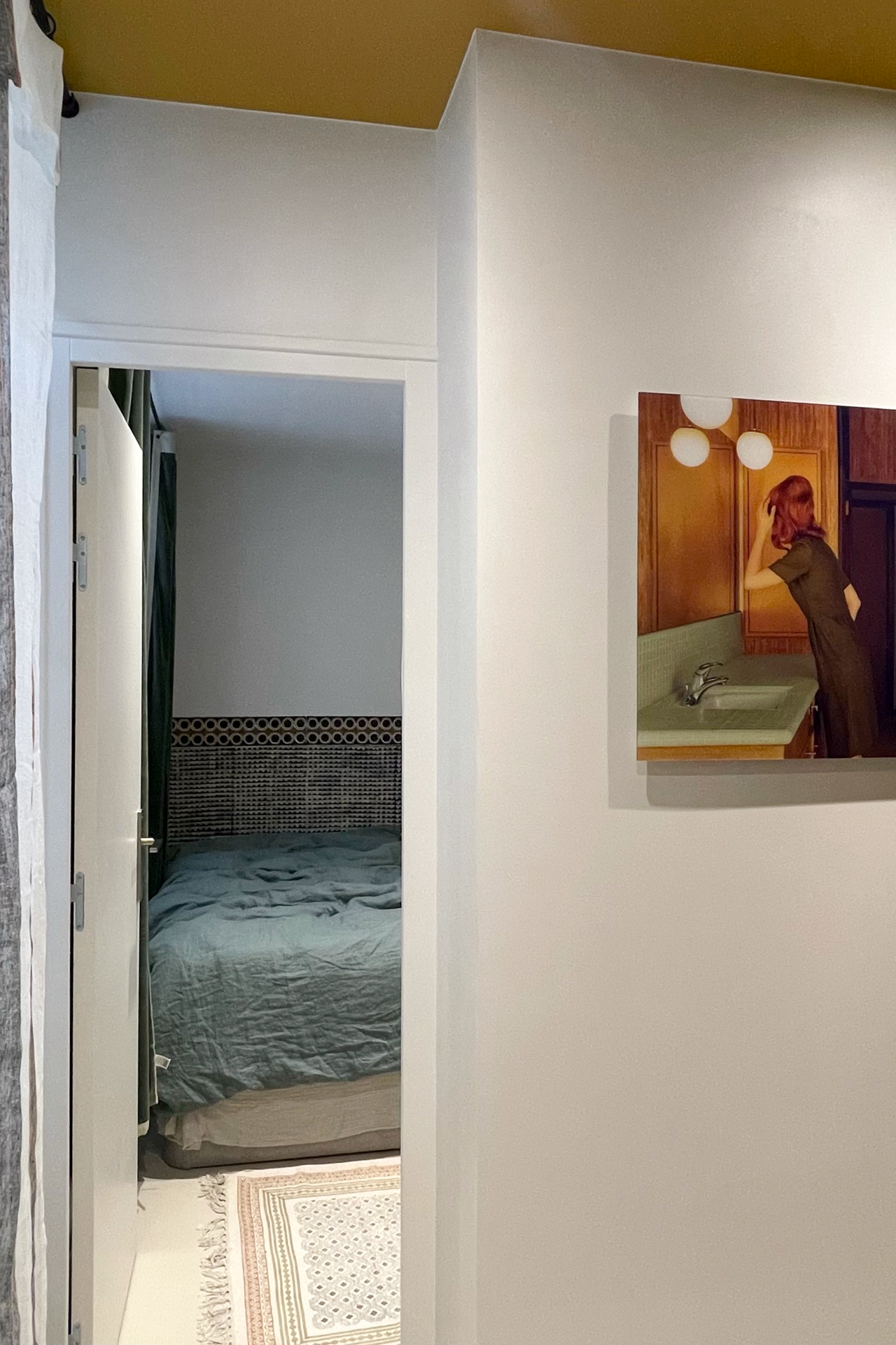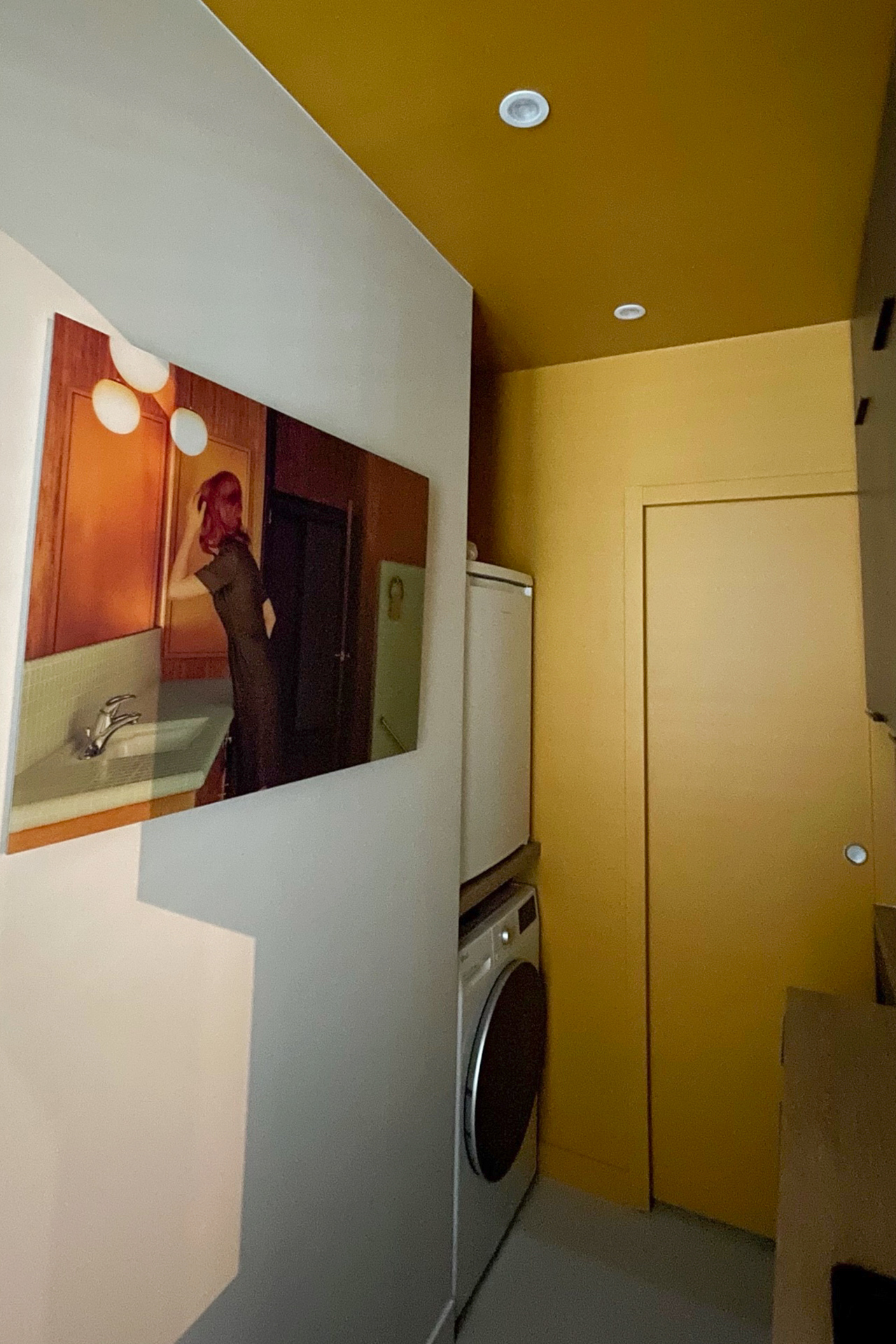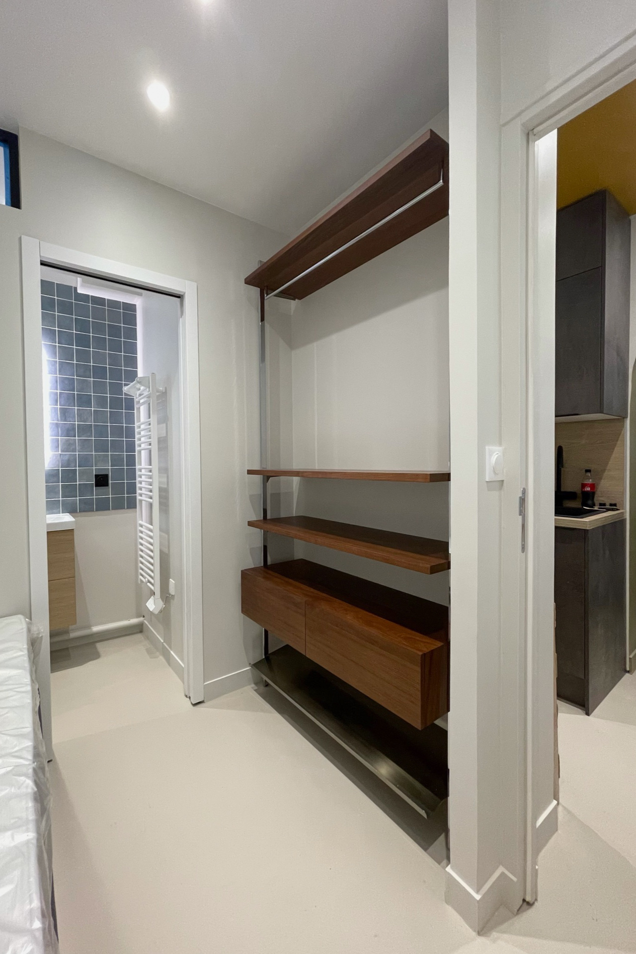 À l’origine, l’entrée débouchait directement sur la cuisine et une salle d’eau avec WC, tandis que la chambre occupait la plus grande surface. La contrainte structurelle du mur séparatif des deux anciens logements s’est alors imposée comme le fil conducteur du projet : intouchable, il organise désormais l’ensemble des circulations.