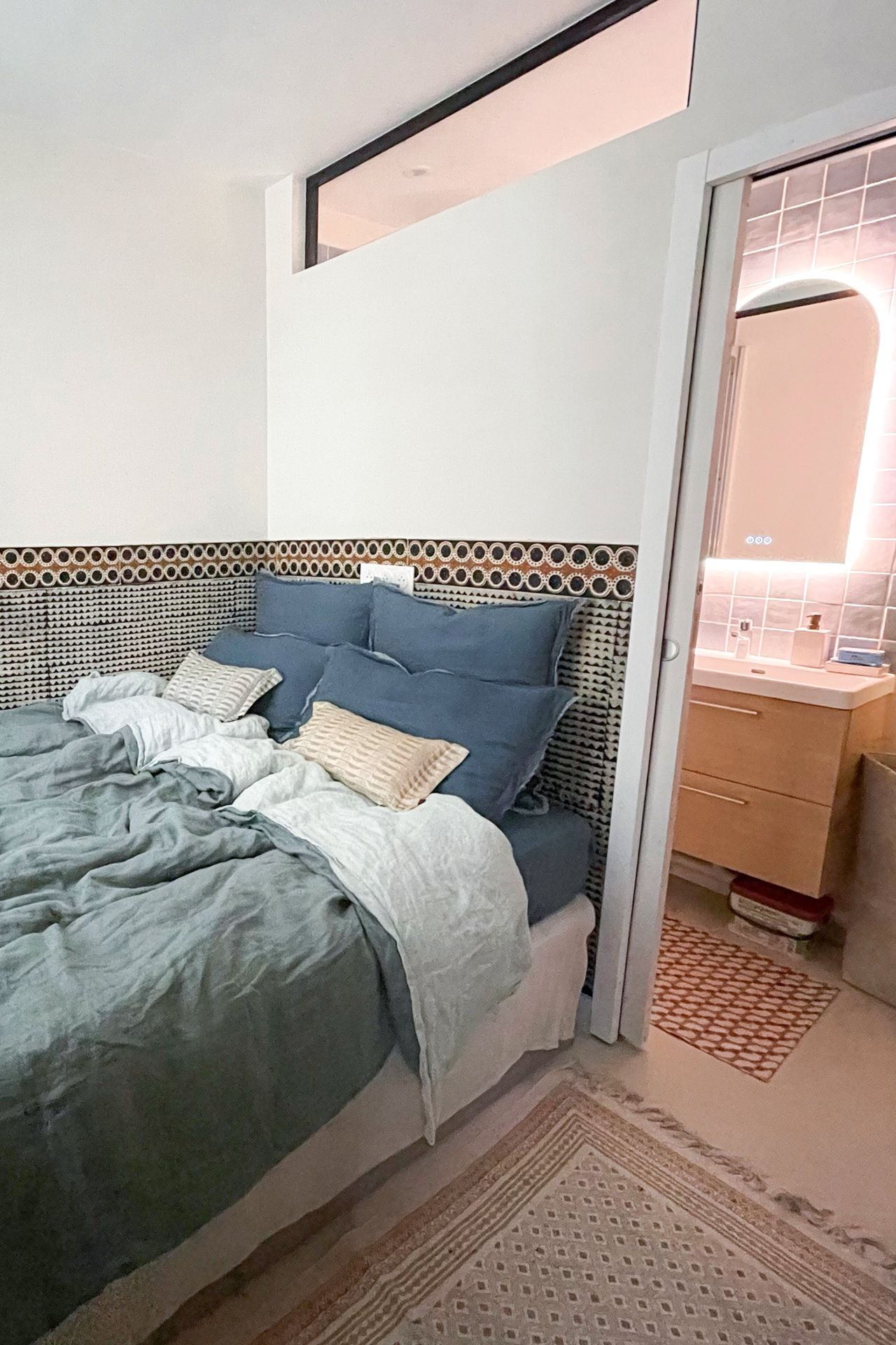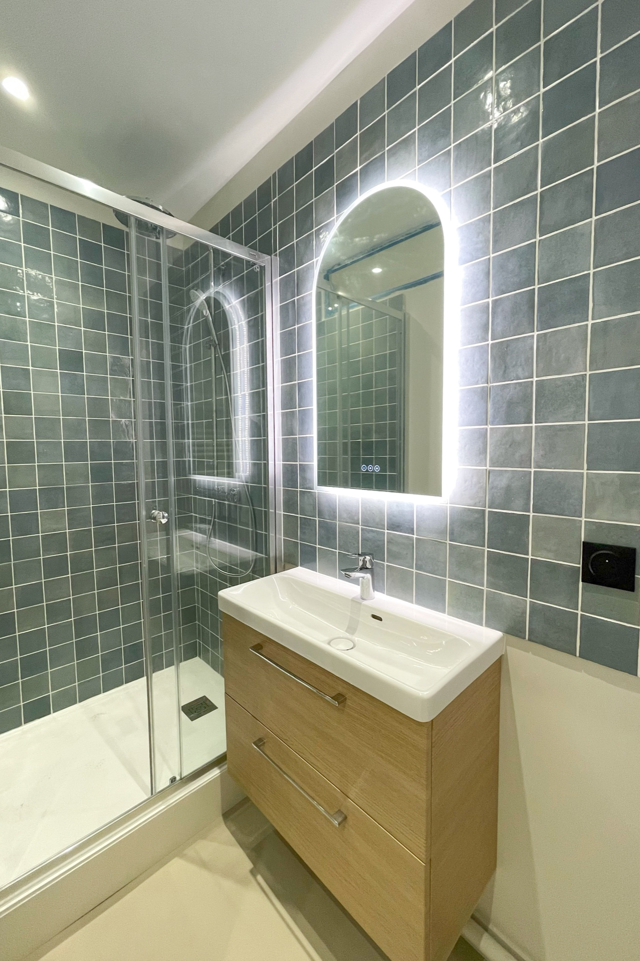 Une nouvelle entrée a été créée depuis l’ancienne chambre, permettant de distribuer le séjour. En contournant le mur porteur, on accède à la cuisine, au fond de laquelle se trouvent les WC, puis à la chambre et à la nouvelle salle de bain. Cette dernière bénéficie d’un apport de lumière naturelle en partie haute, garantissant intimité et confort. L’ensemble forme un parcours fluide et cohérent, optimisé pour tirer le meilleur parti de la surface disponible.