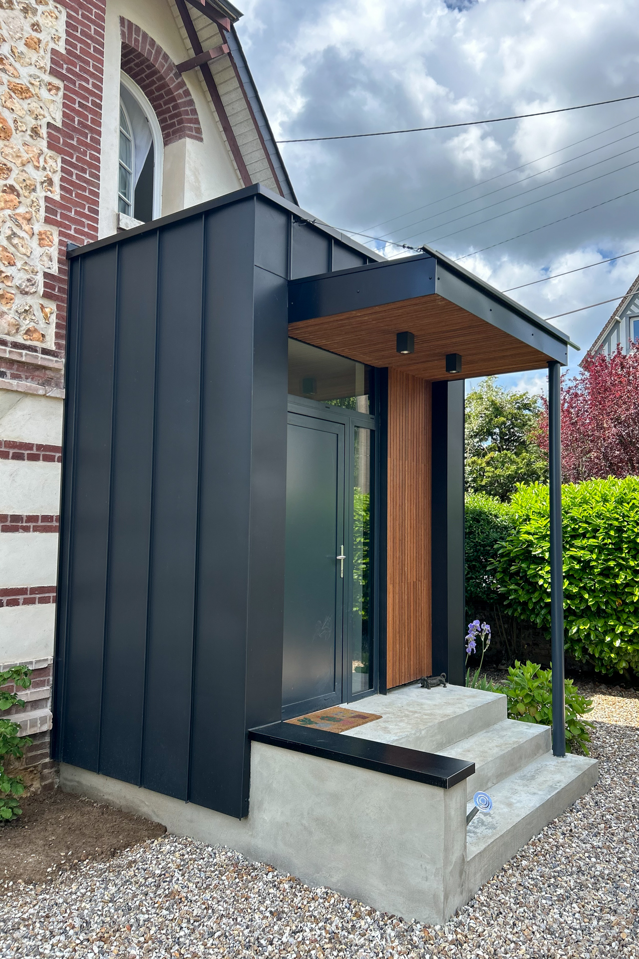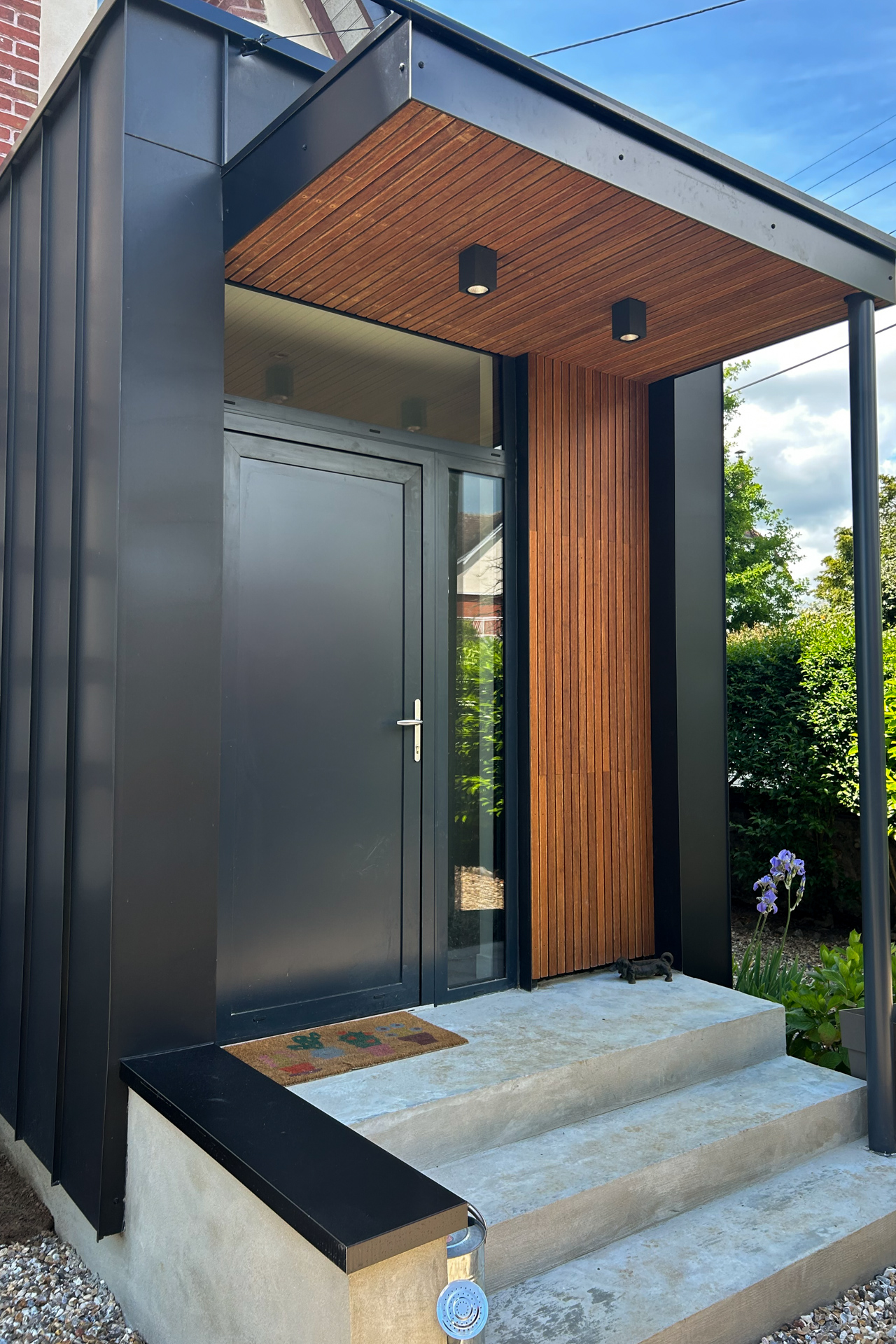 Enfin, une seconde extension vient résoudre la problématique d’une entrée peu fonctionnelle : elle crée un sas d’accueil abrité, intègre des rangements et améliore les circulations pour un usage plus pratique au quotidien.