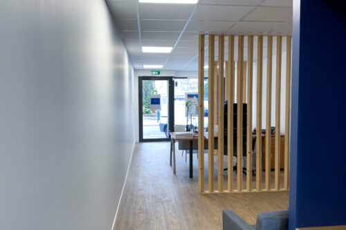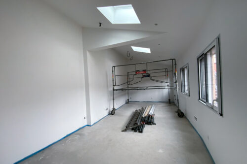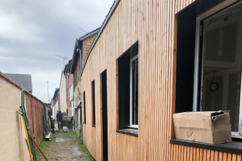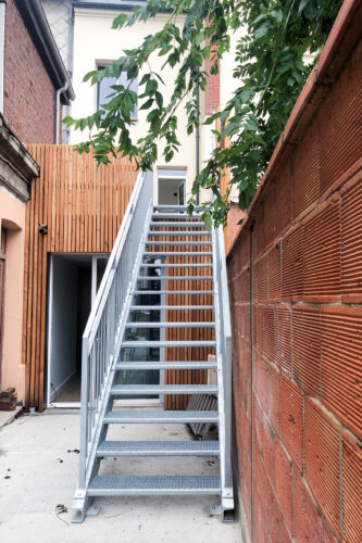 Nous avons entièrement repensé l’immeuble sur rue, autrefois occupé par une boucherie au rez-de-chaussée et un logement à l’étage. Il a été transformé et agrandi pour accueillir une agence d’assurance, tandis que l’étage a été réhabilité en logement confortable. Un accès privatif, qui n’existait pas auparavant, a été créé pour desservir les trois niveaux supérieurs.