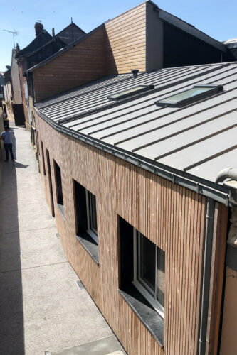 L’extension réalisée sur la cour apporte un bureau supplémentaire, baigné de lumière, et crée dans le même mouvement une terrasse et un accès indépendant vers le logement.