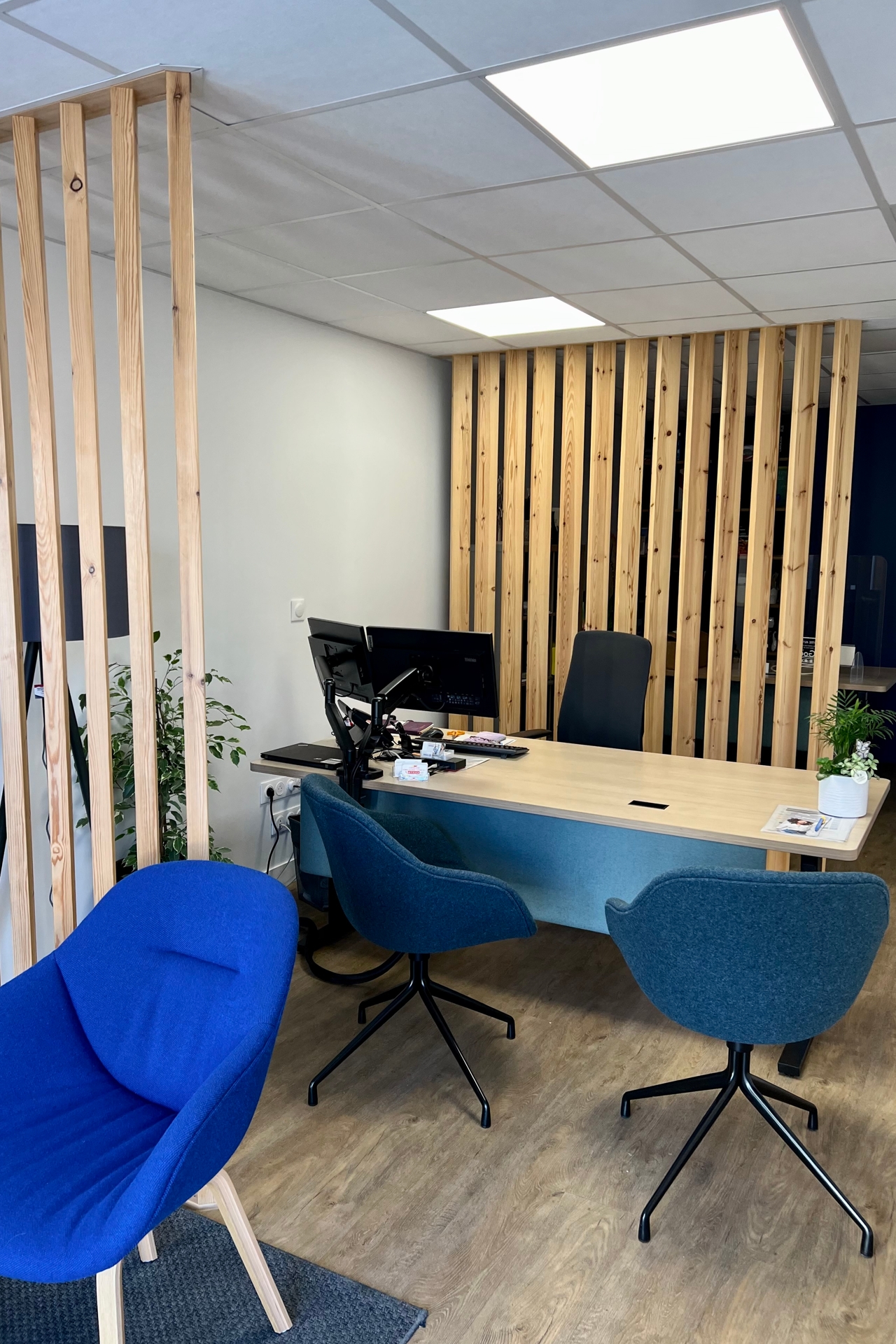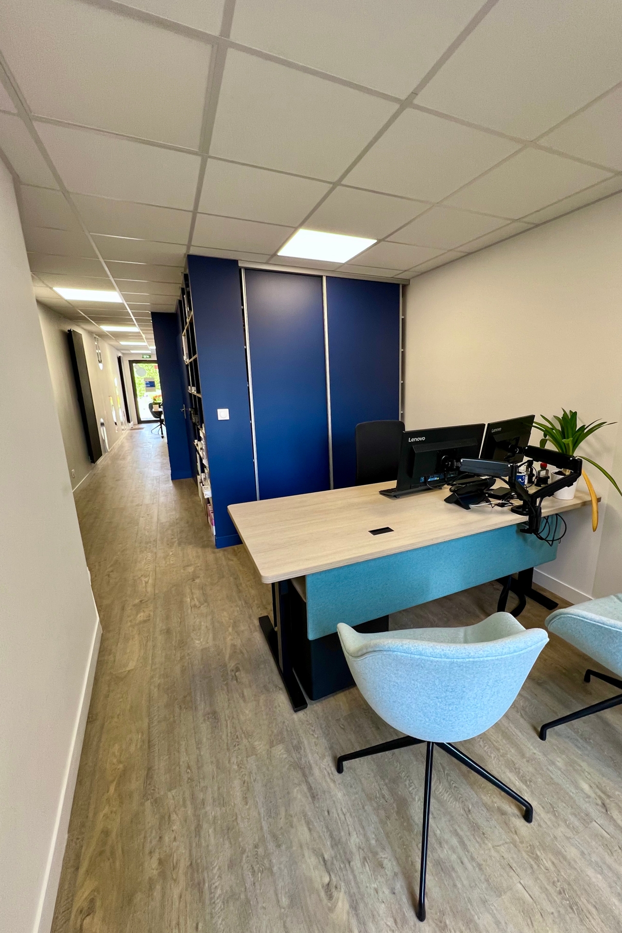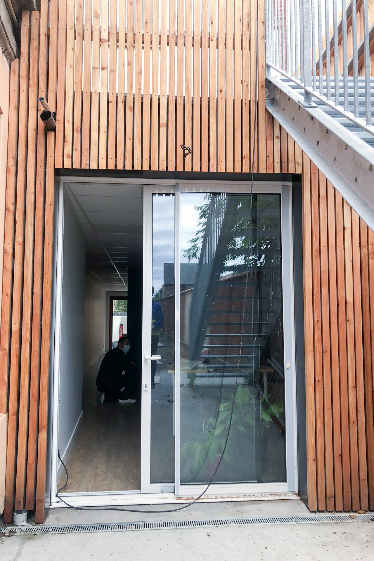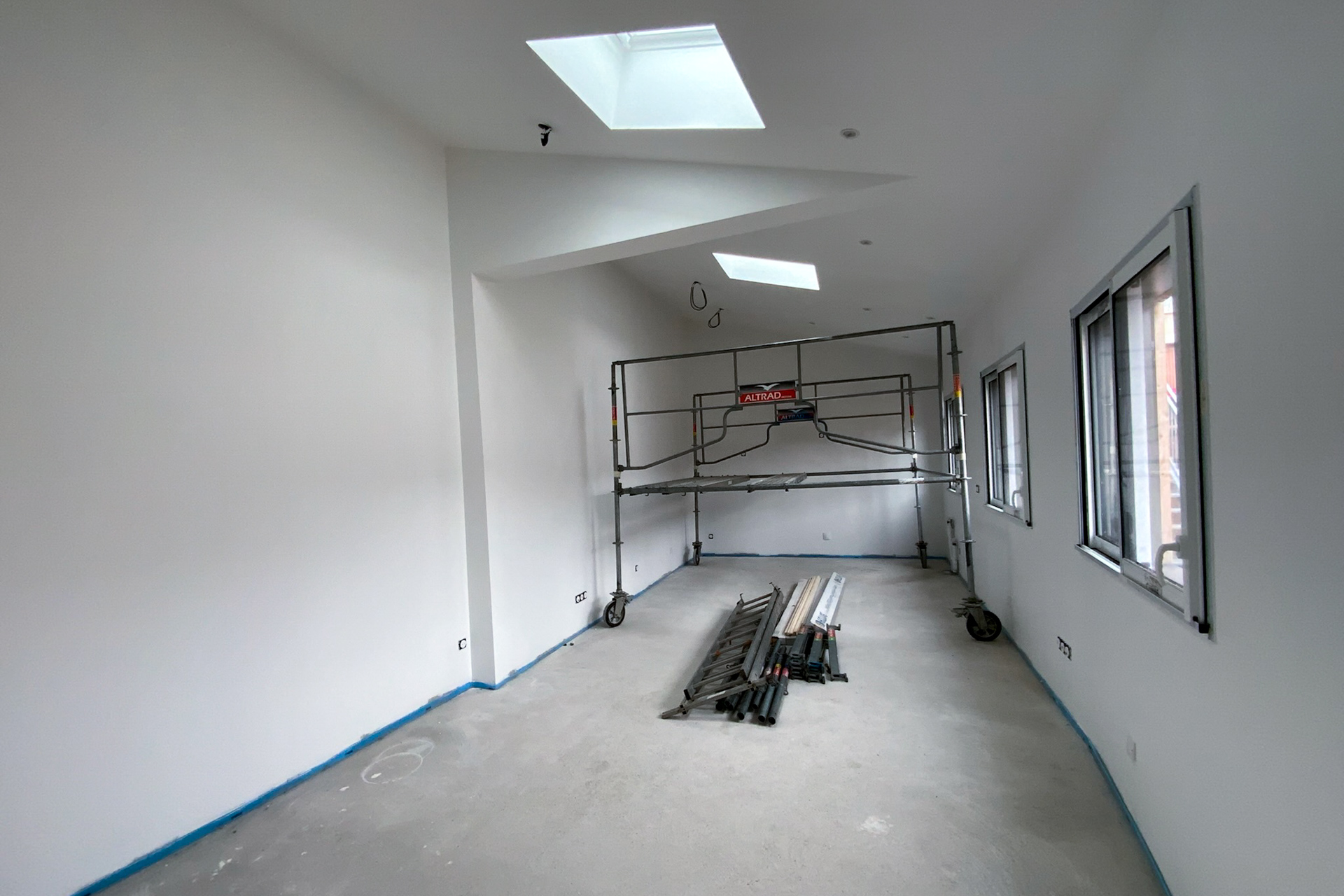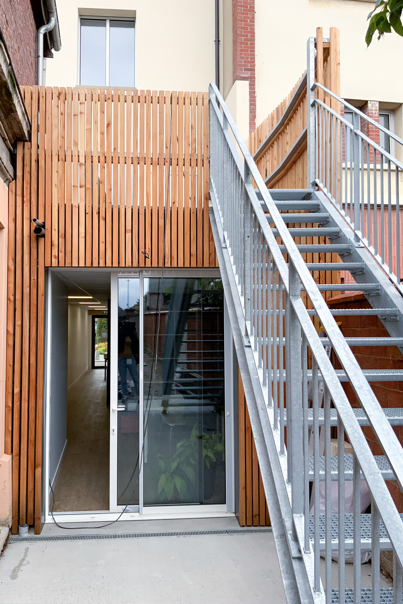L’extension réalisée sur la cour apporte un bureau supplémentaire, baigné de lumière, et crée dans le même mouvement une terrasse et un accès indépendant vers le logement.