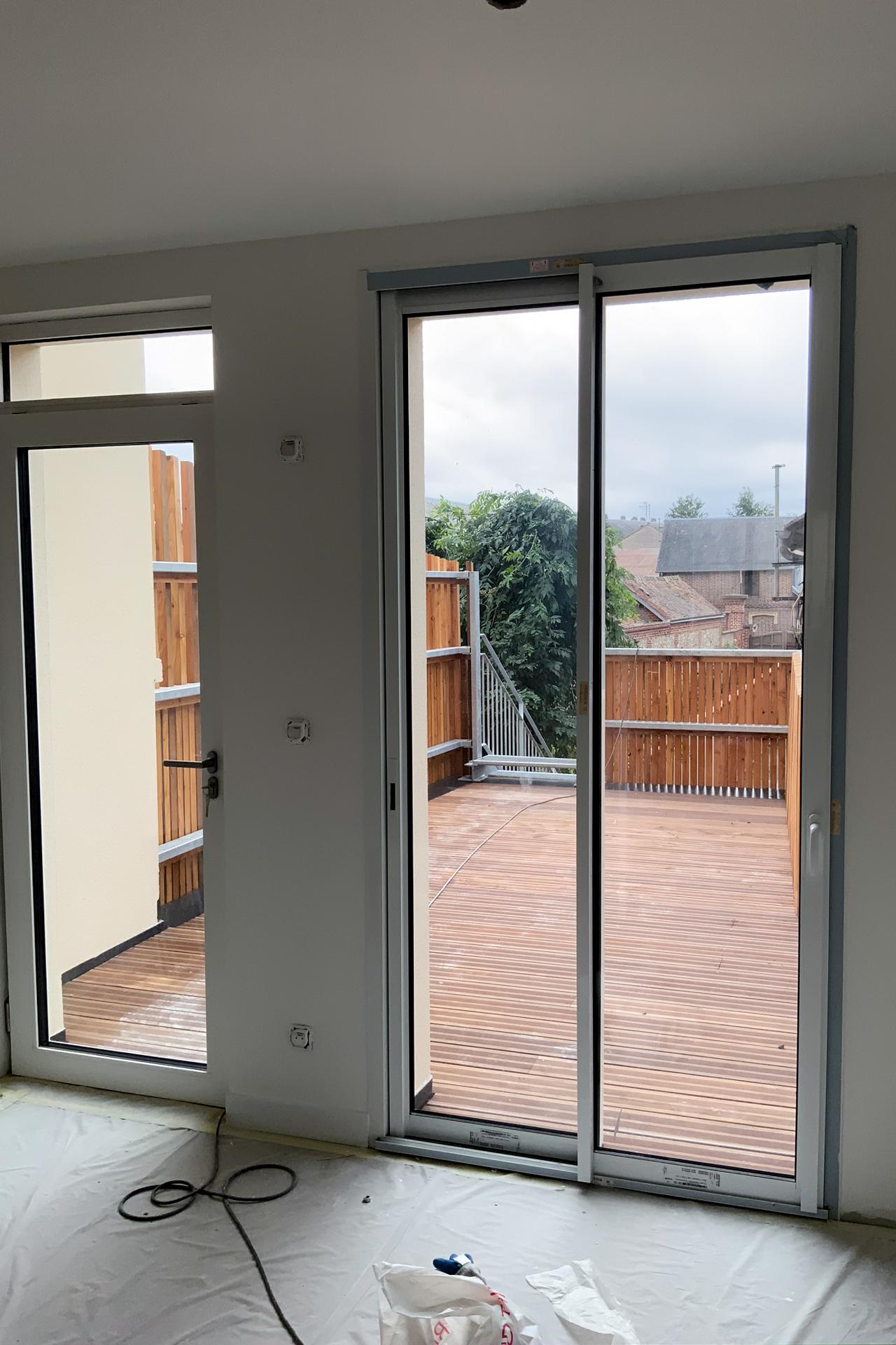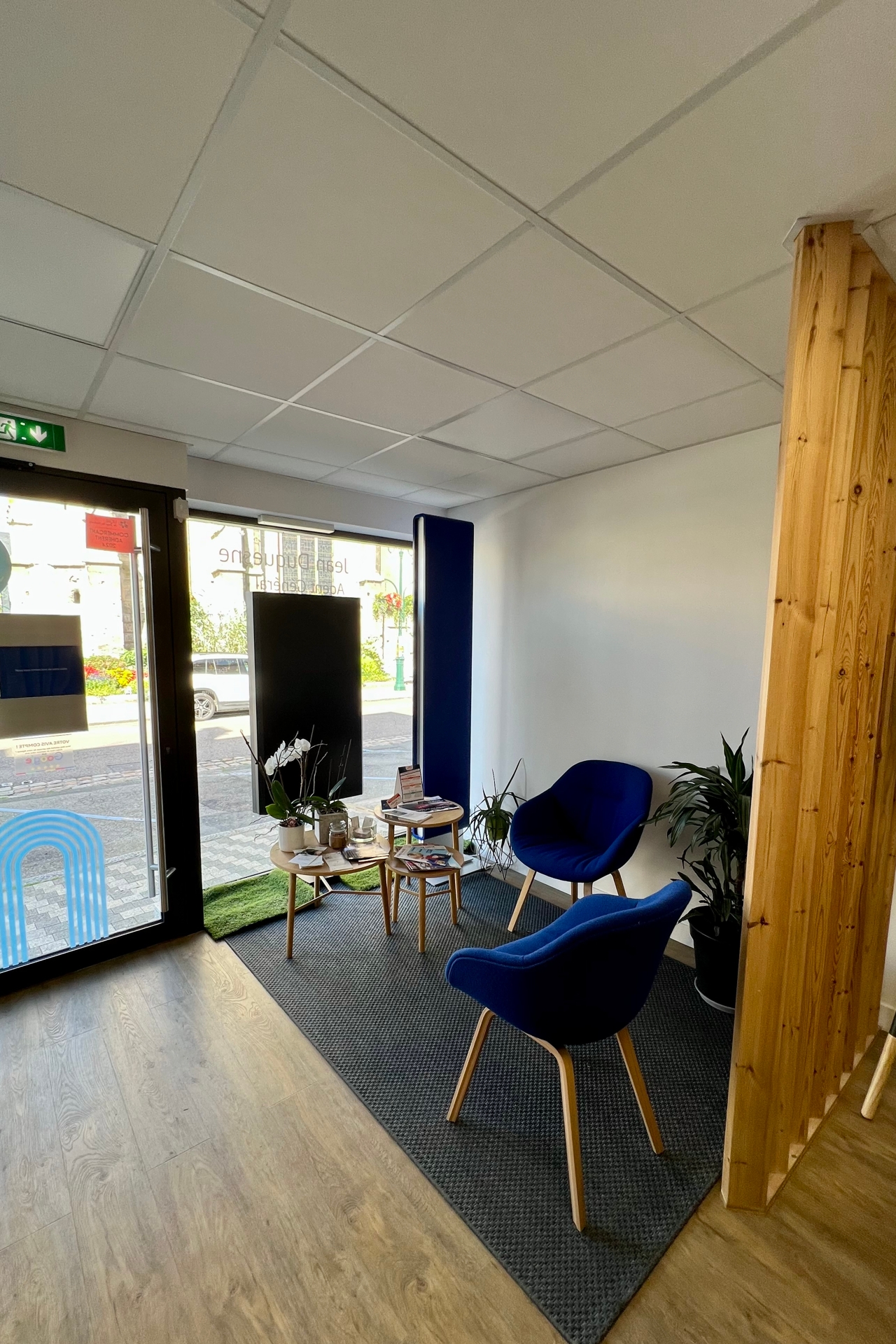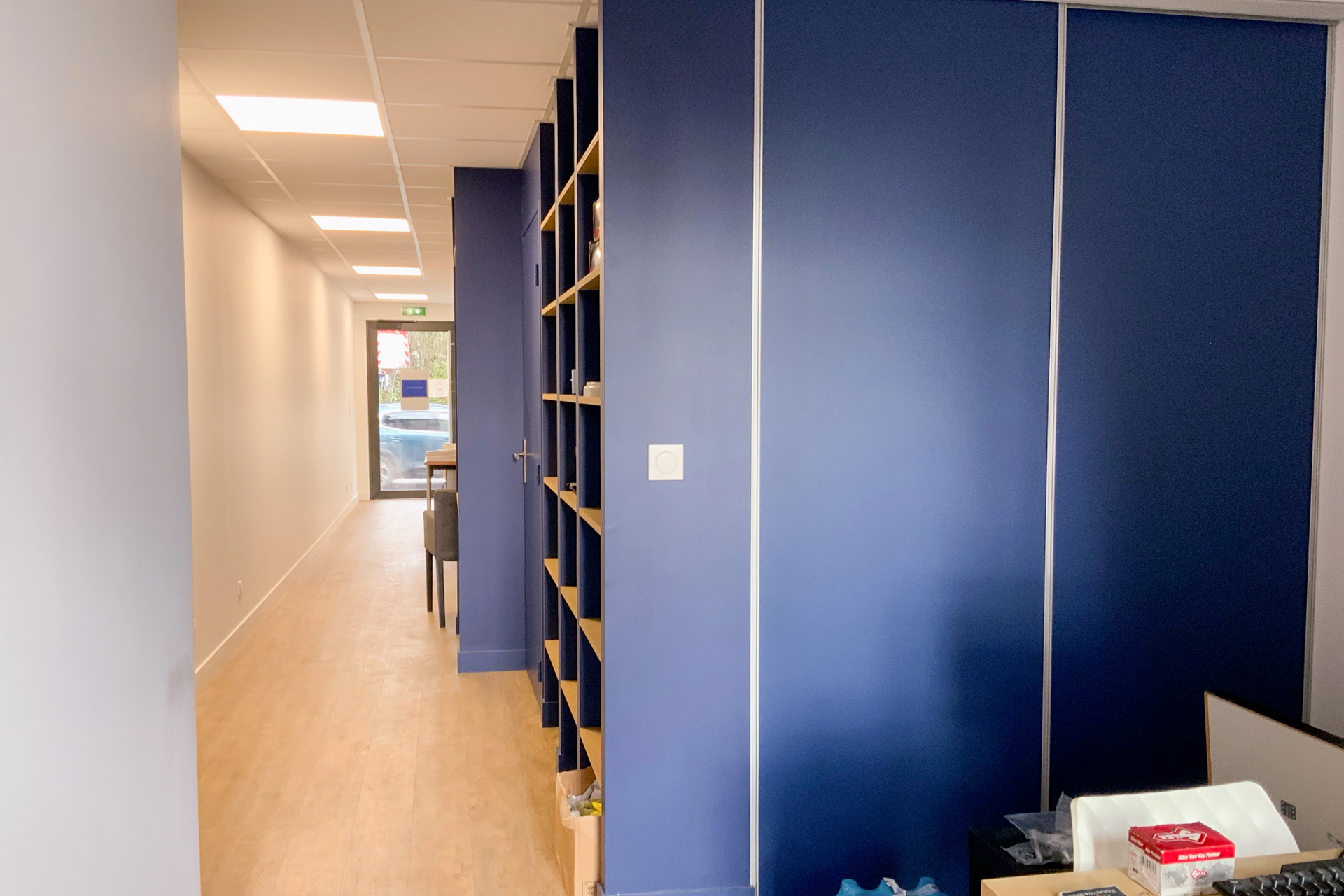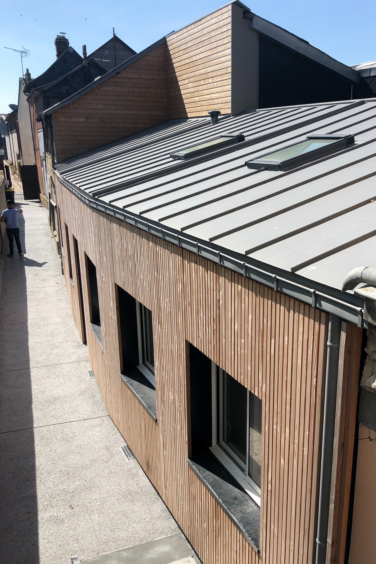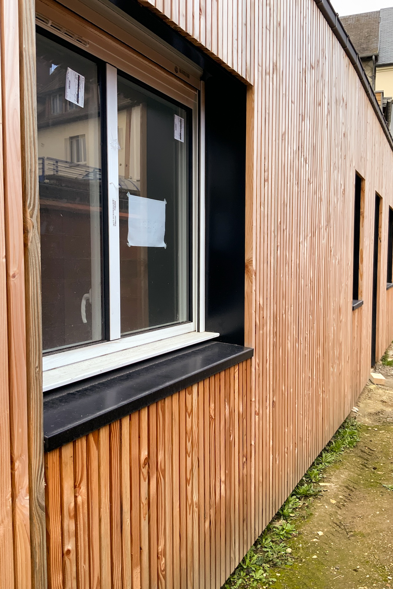 Nous avons entièrement repensé l’immeuble sur rue, autrefois occupé par une boucherie au rez-de-chaussée et un logement à l’étage. Il a été transformé et agrandi pour accueillir une agence d’assurance, tandis que l’étage a été réhabilité en logement confortable. Un accès privatif, qui n’existait pas auparavant, a été créé pour desservir les trois niveaux supérieurs.