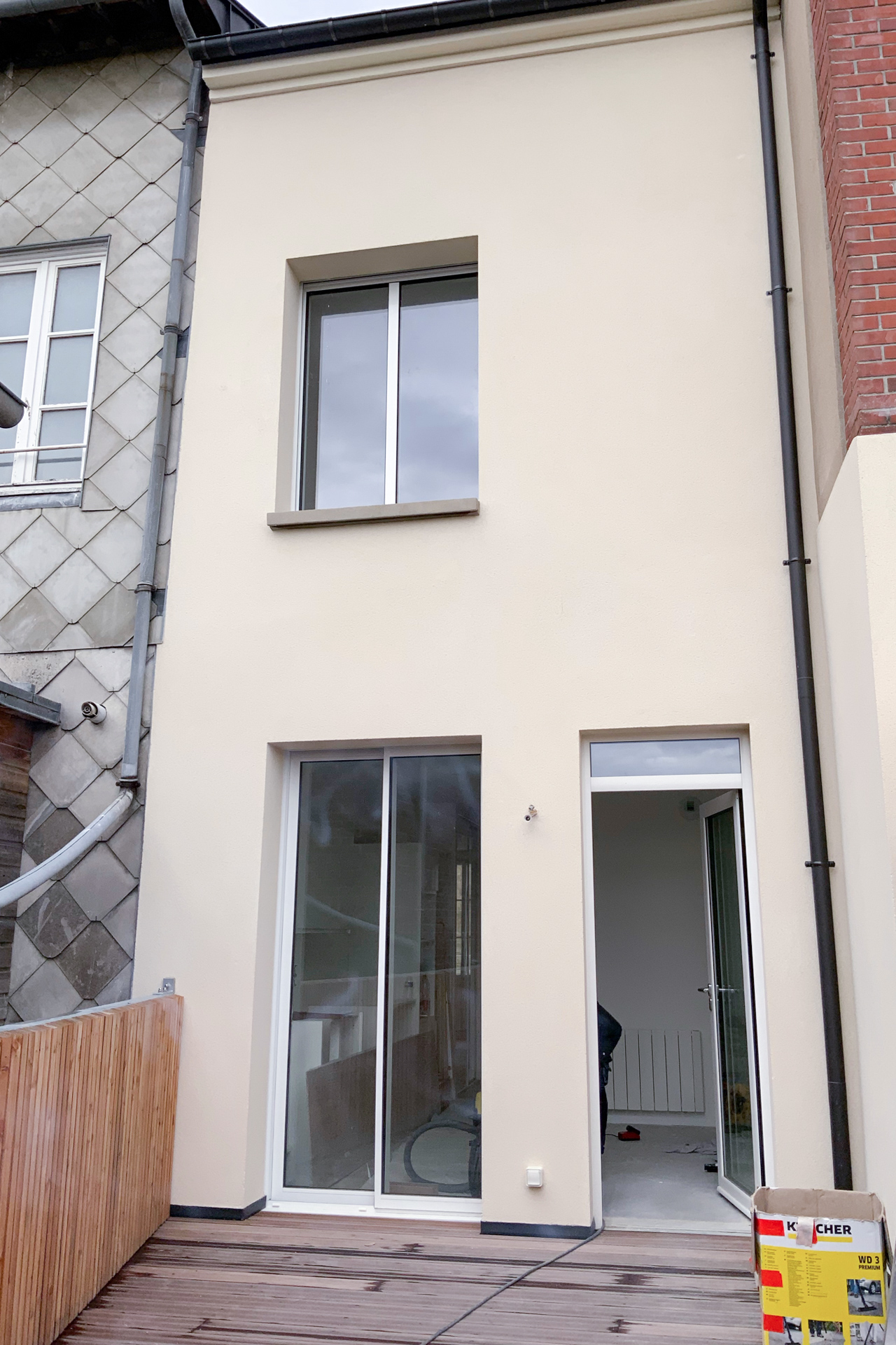Le second bâtiment, trop vétuste, a été démoli pour laisser place à un nouveau logement tout en longueur, ouvert sur la cour et pensé pour offrir une qualité de vie généreuse malgré la finesse de la parcelle.