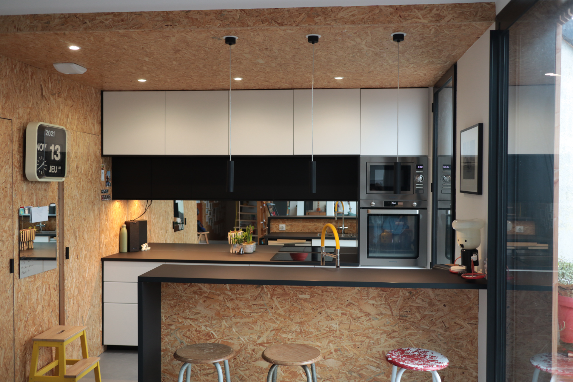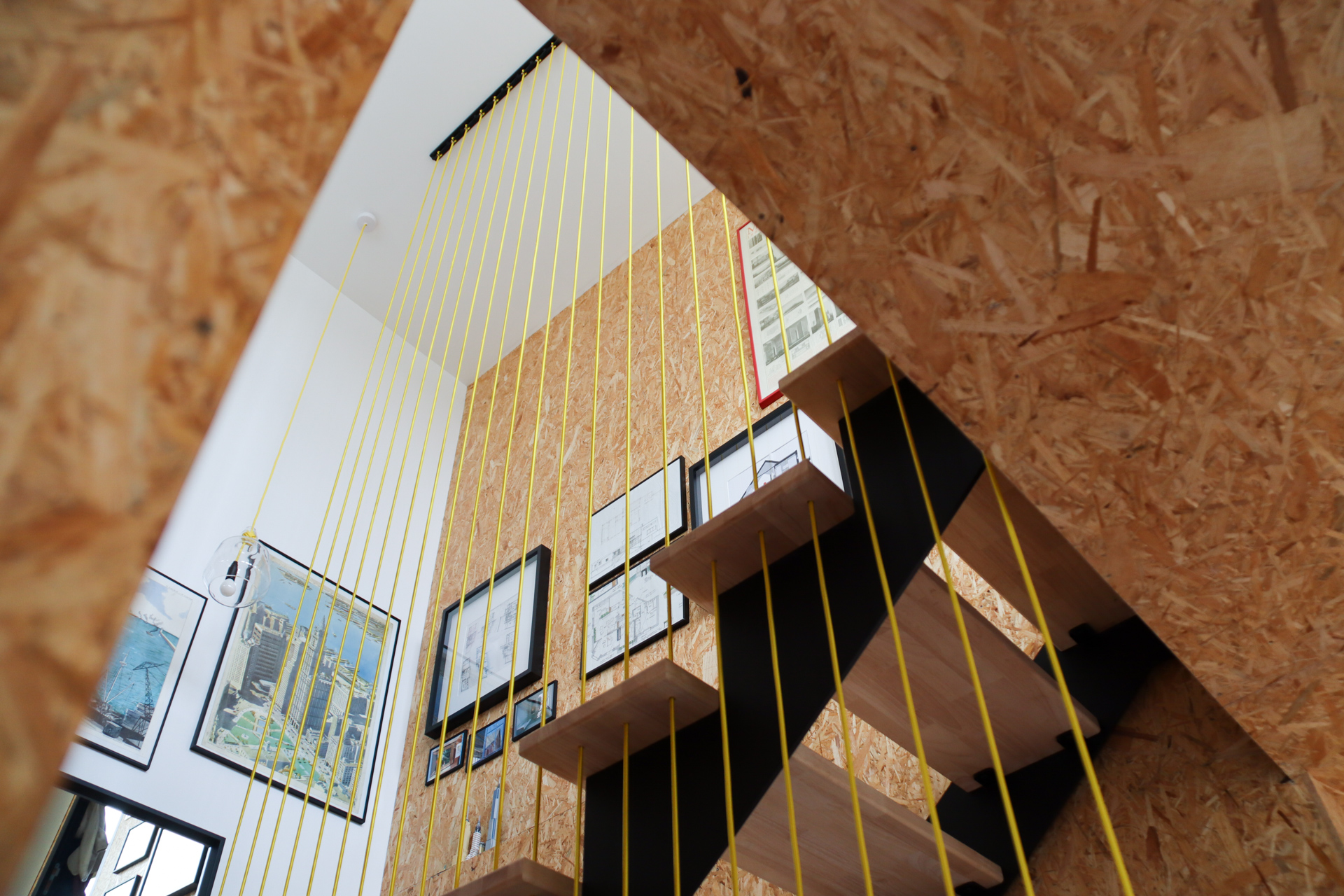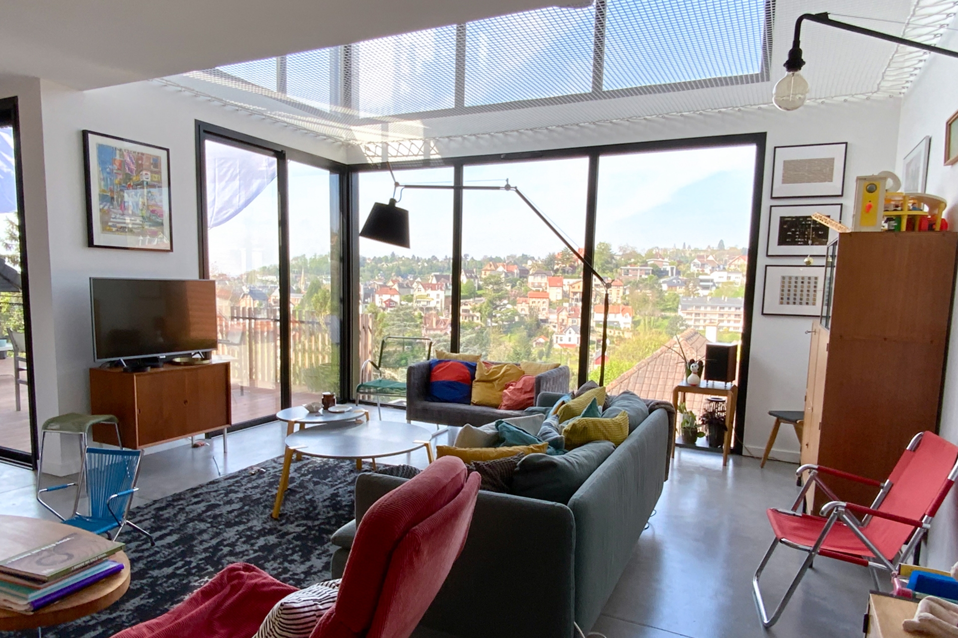 À l’étage, un volume en surplomb accueille le bureau et sa terrasse orientée vers la ville, ainsi que le niveau parental comprenant une terrasse protégée. Une plateforme en filet suspendue au-dessus du séjour offre un espace atypique tout en révélant la double hauteur.
