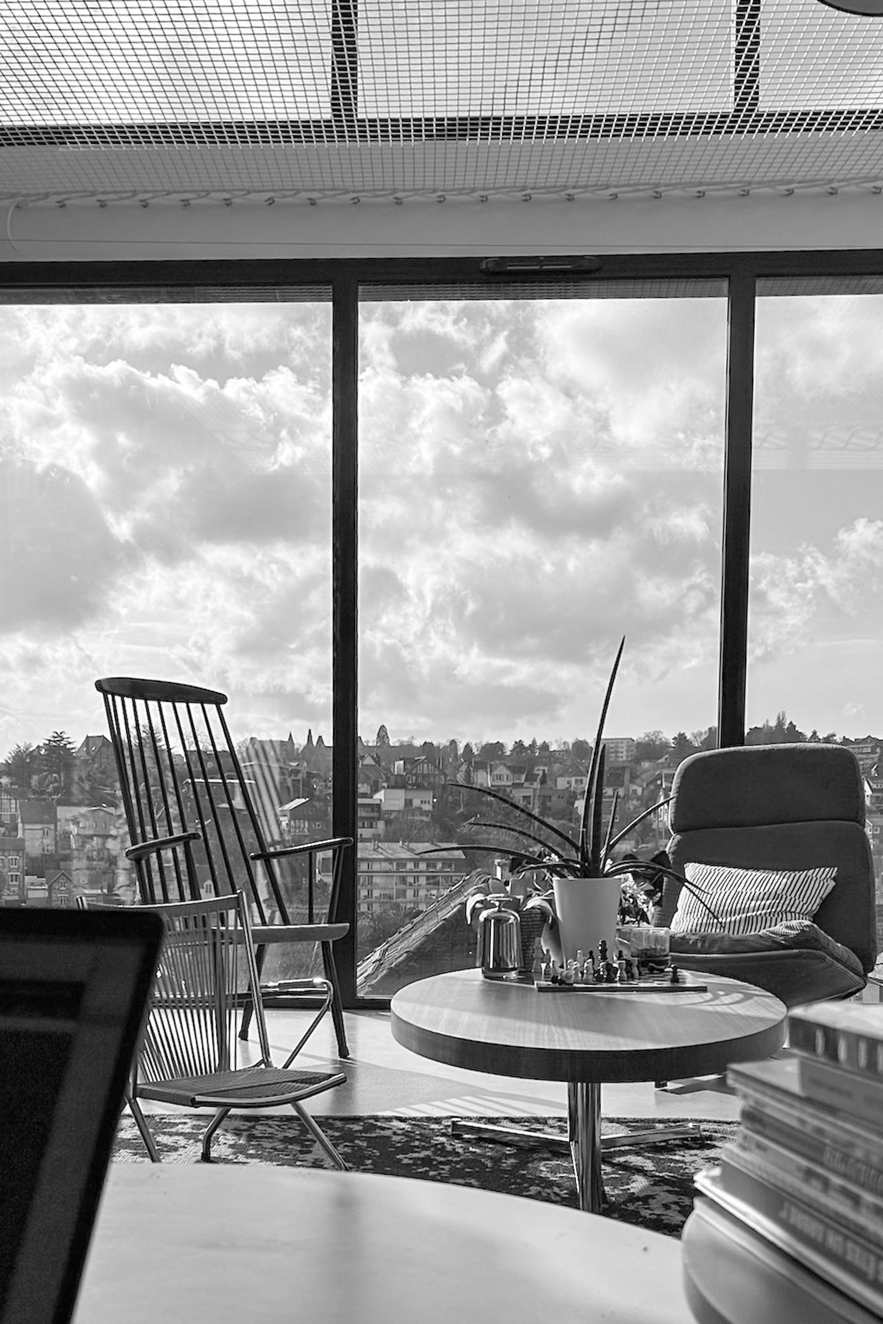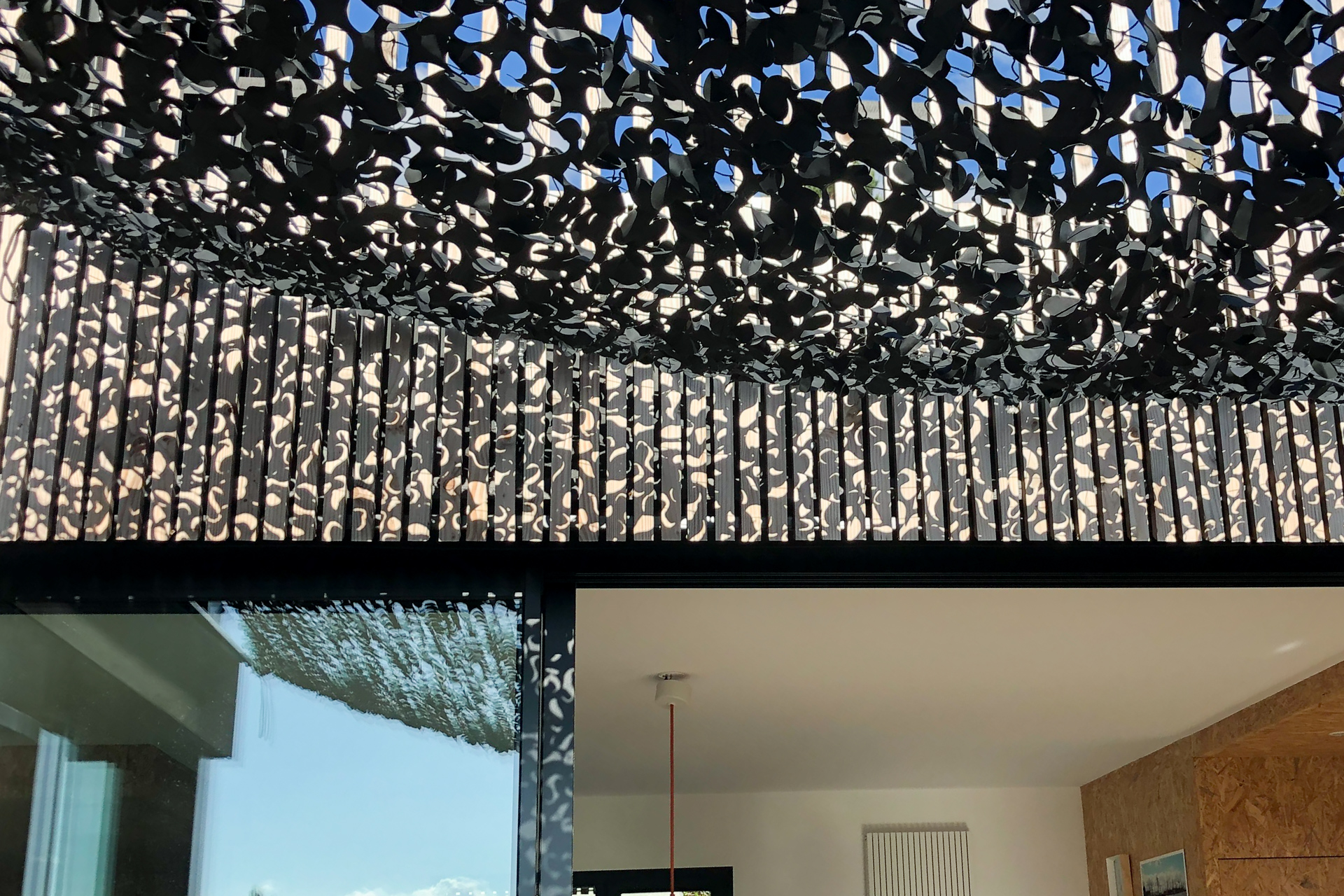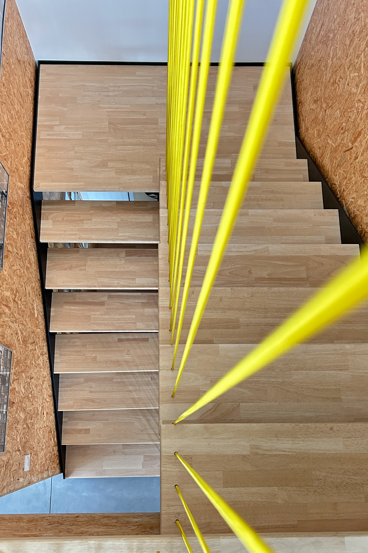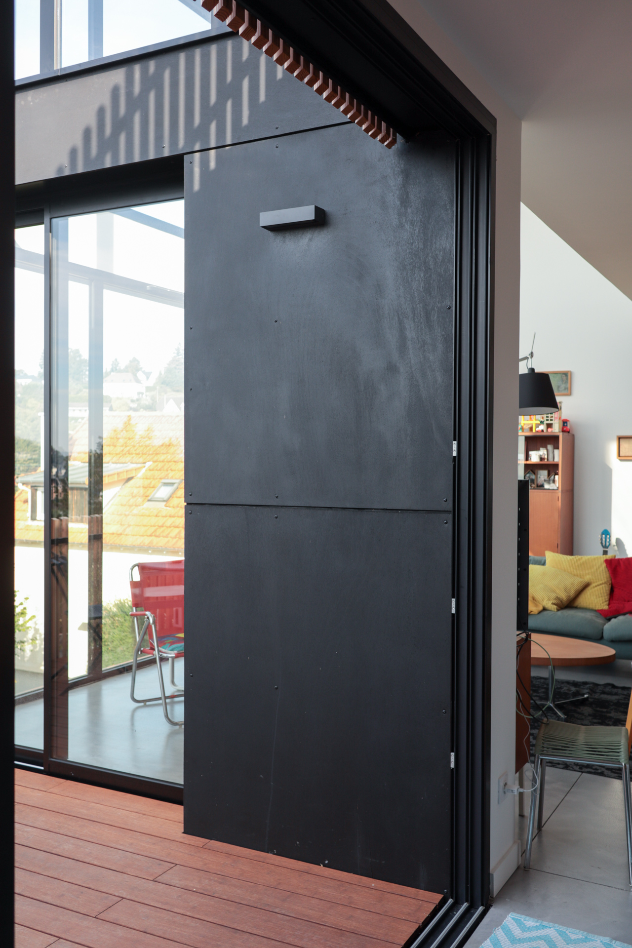 À l’étage, un volume en surplomb accueille le bureau et sa terrasse orientée vers la ville, ainsi que le niveau parental comprenant une terrasse protégée. Une plateforme en filet suspendue au-dessus du séjour offre un espace atypique tout en révélant la double hauteur.