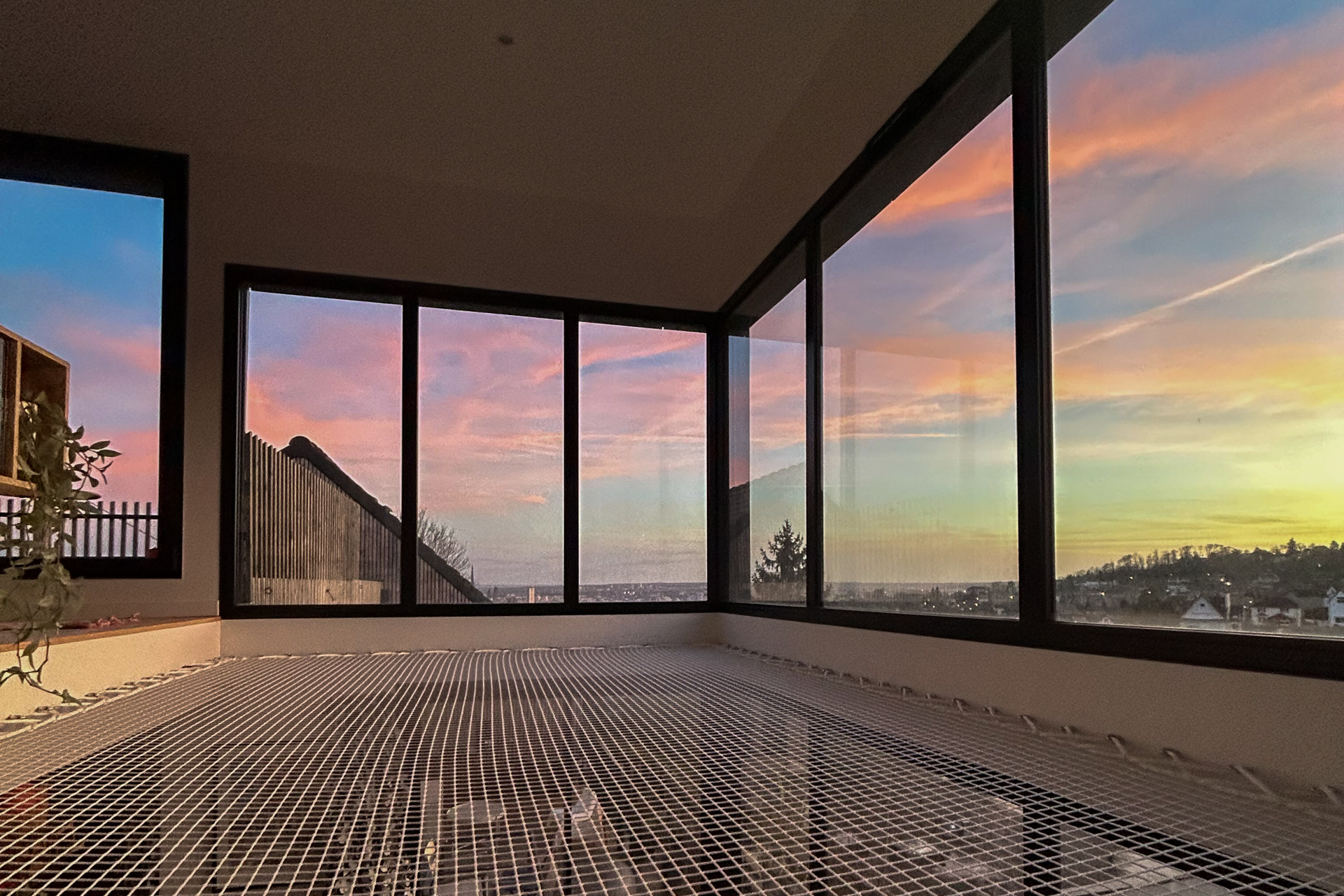 Au niveau de la rue, les espaces de vie du rez-de-chaussée sont entièrement ouverts — séjour, cuisine et salle à manger ne forment qu’un seul volume généreux et lumineux, pleinement orienté vers la ville et la vallée. Une grande terrasse prolonge ces espaces, créant une continuité directe entre intérieur et extérieur. Les surfaces sont optimisées : un cellier-dressing à l’entrée, un second cellier attenant à la cuisine et un garage complètent ce niveau.