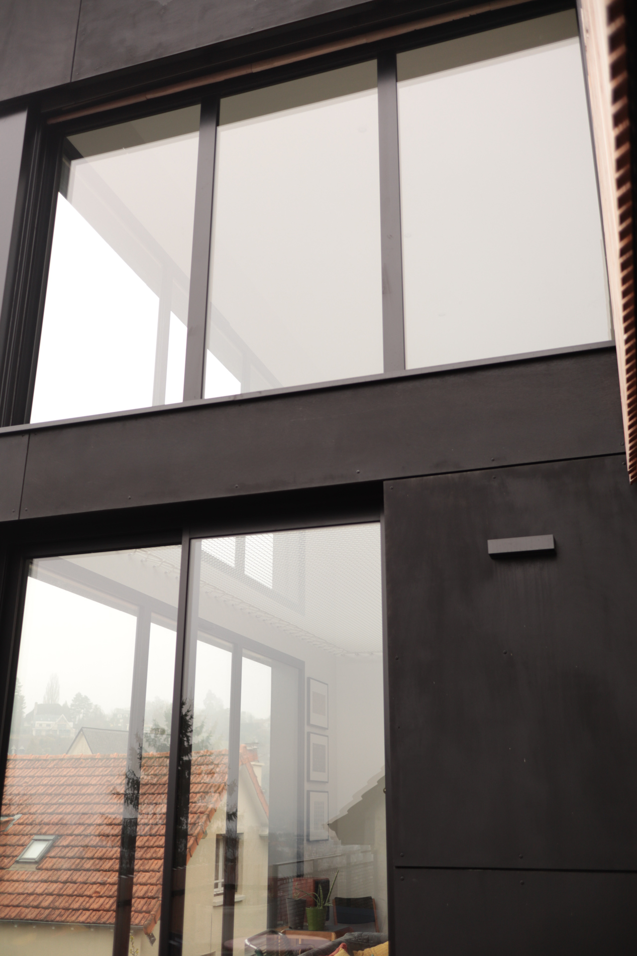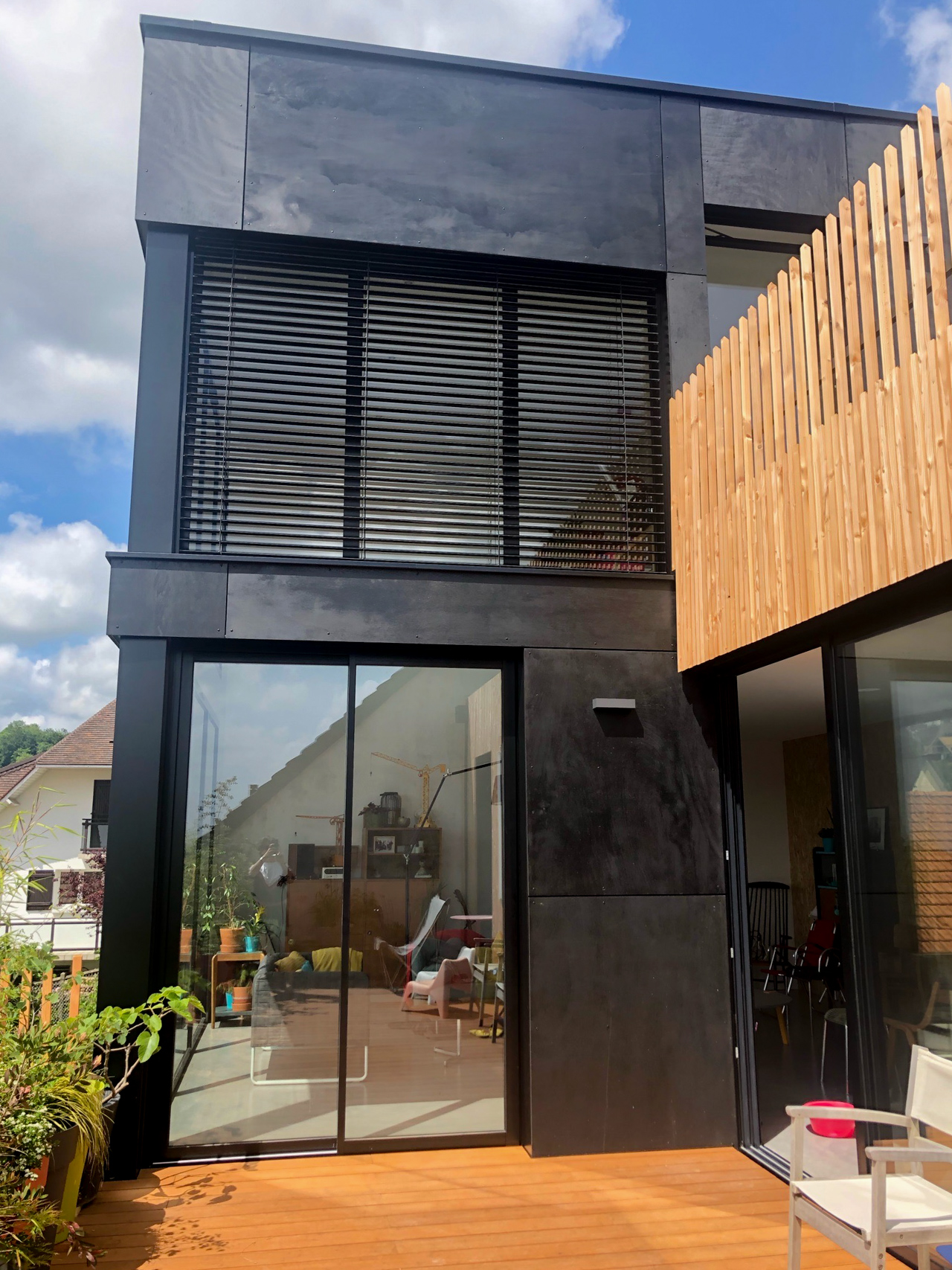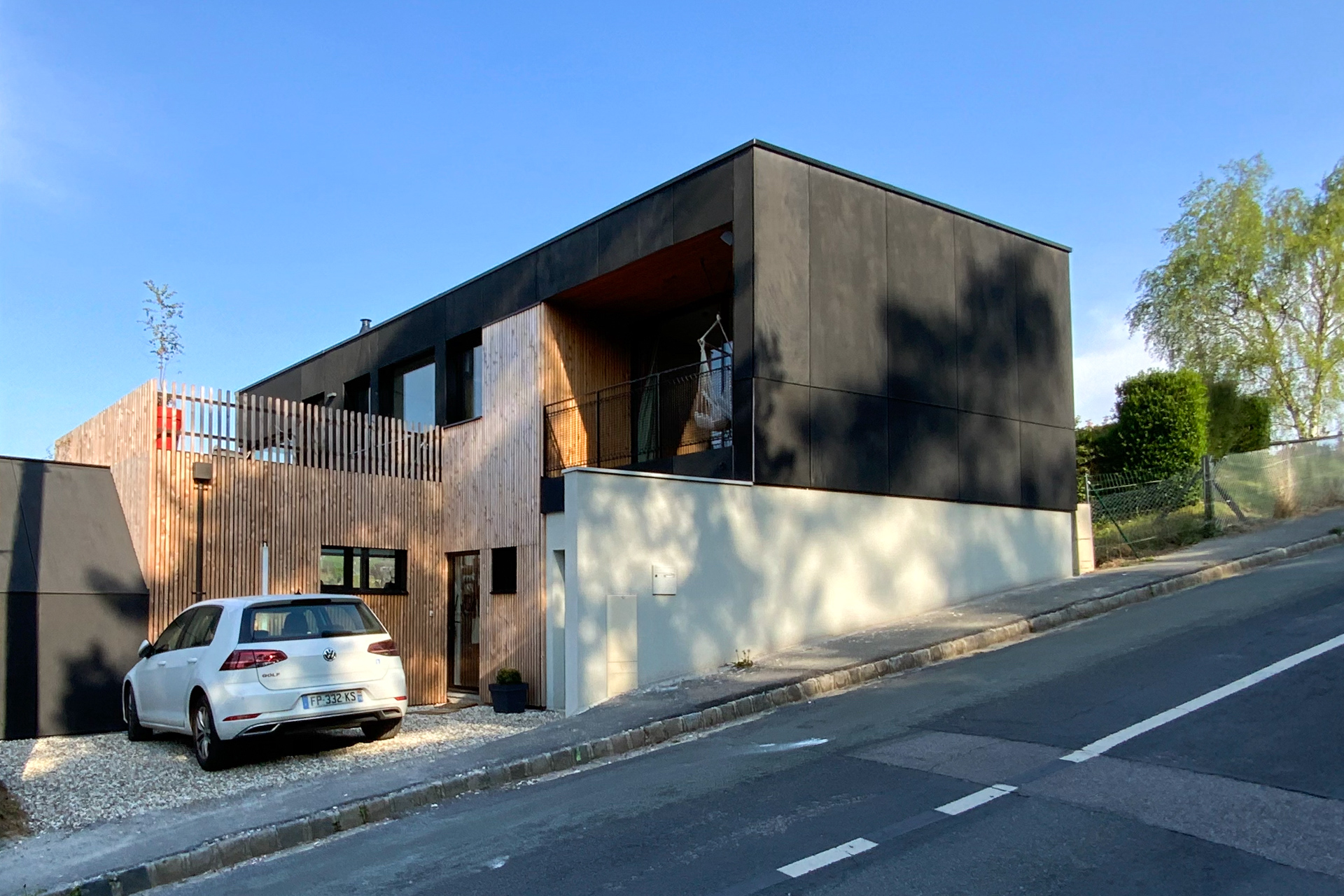 Pensée pour une famille de trois personnes et un bureau, la construction s’inscrit dans la pente afin de composer avec son environnement immédiat : la rue, la maison voisine et la topographie. Accolée au pignon existant, elle se structure autour des perspectives, de l’ensoleillement et de circulations fluides.