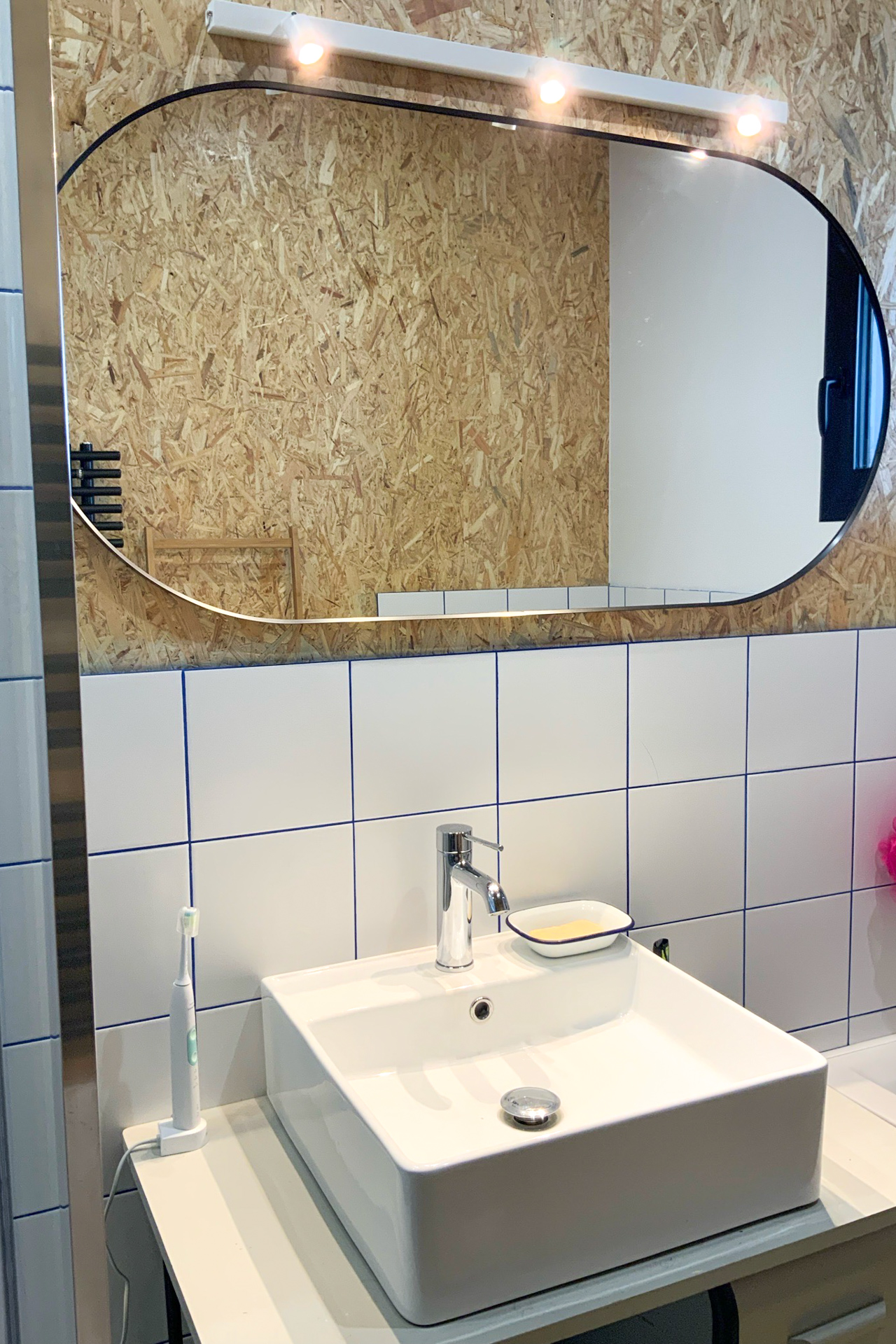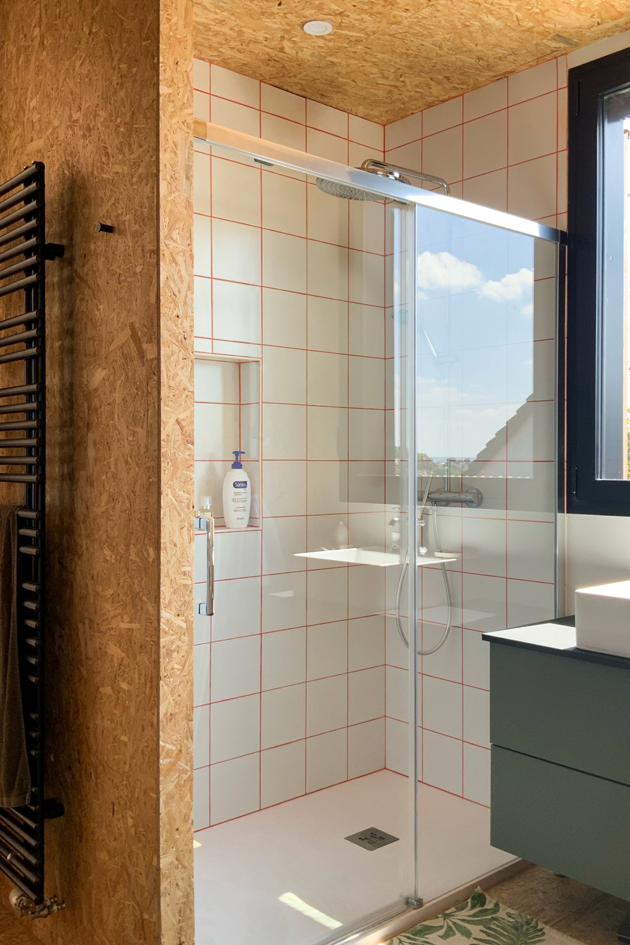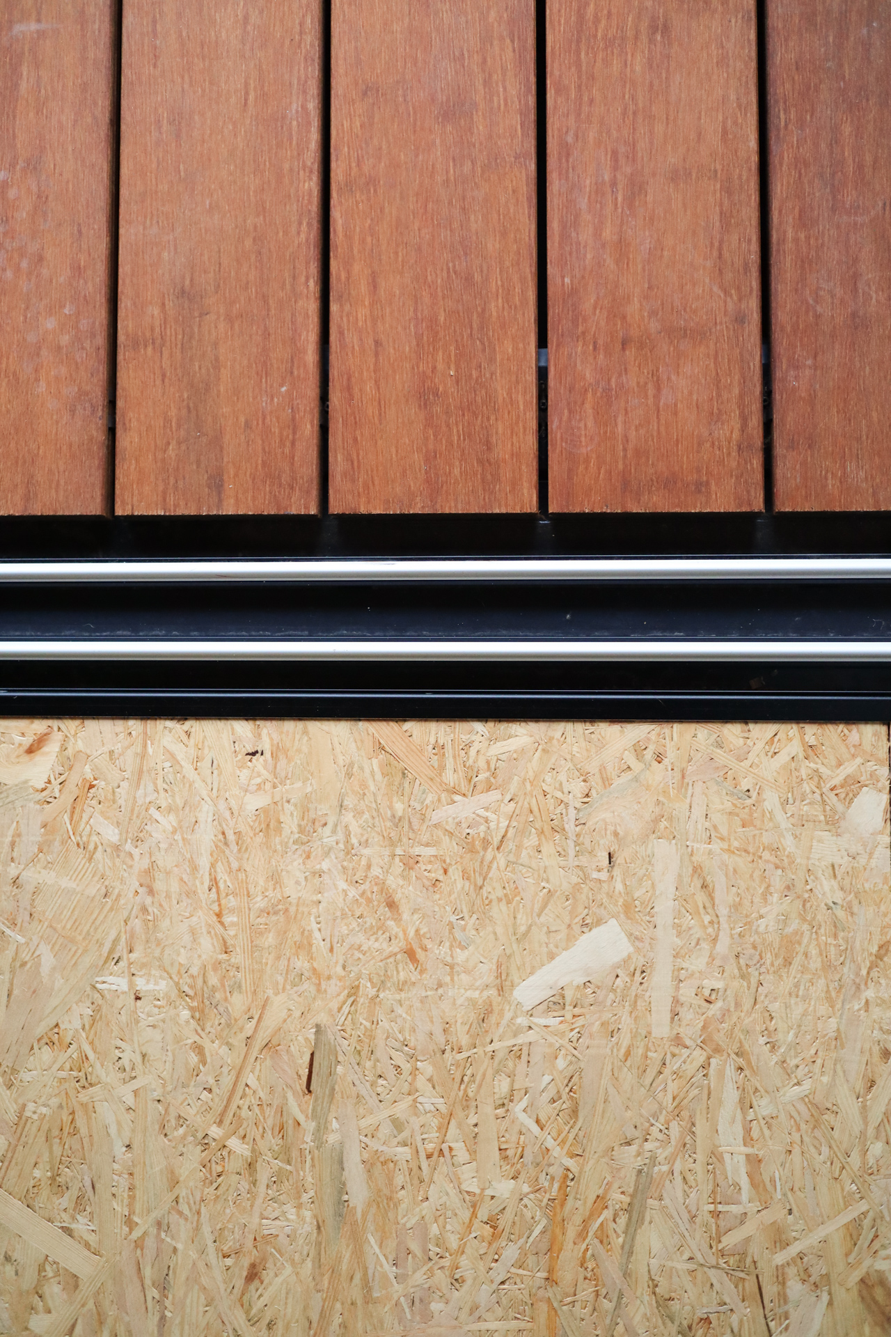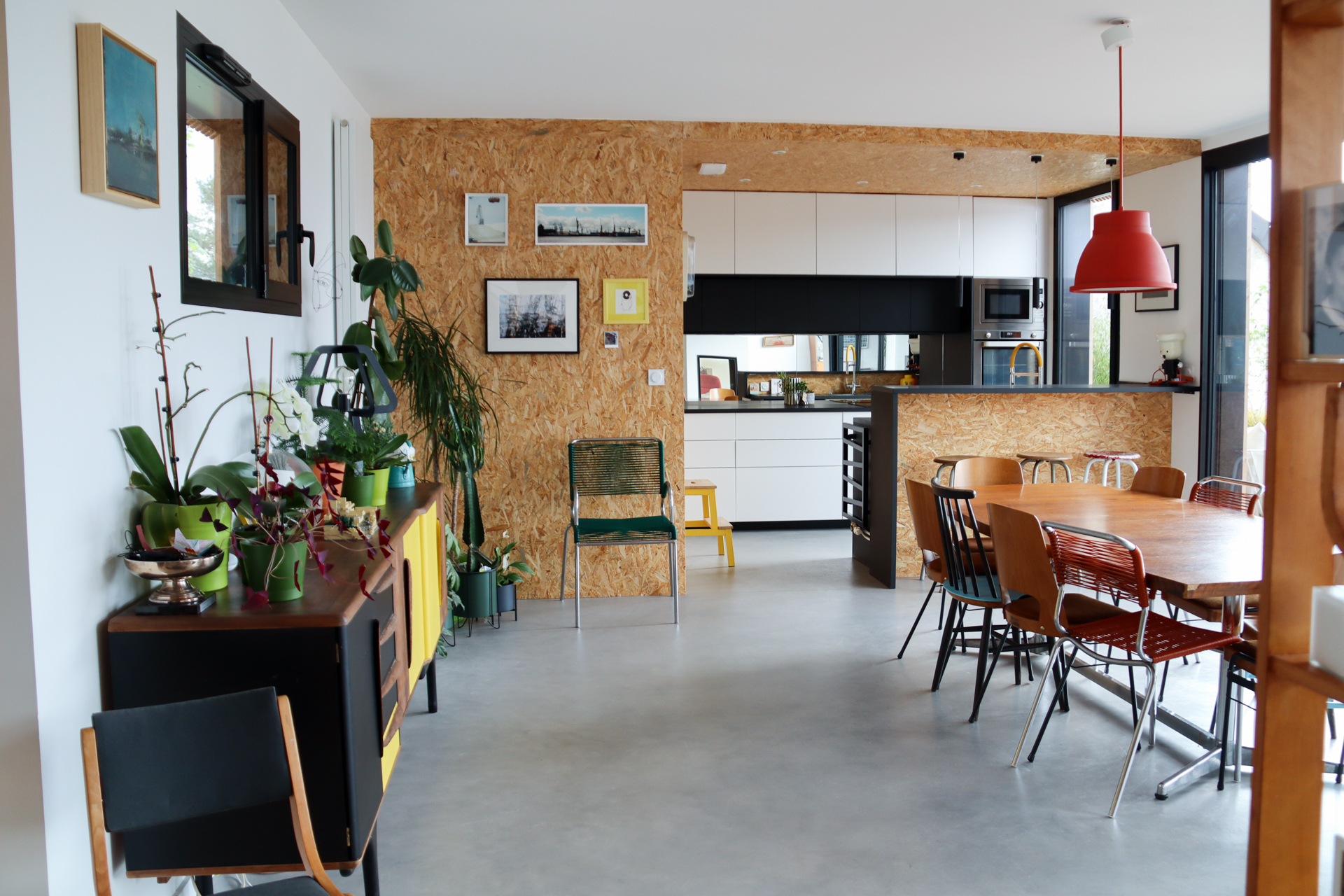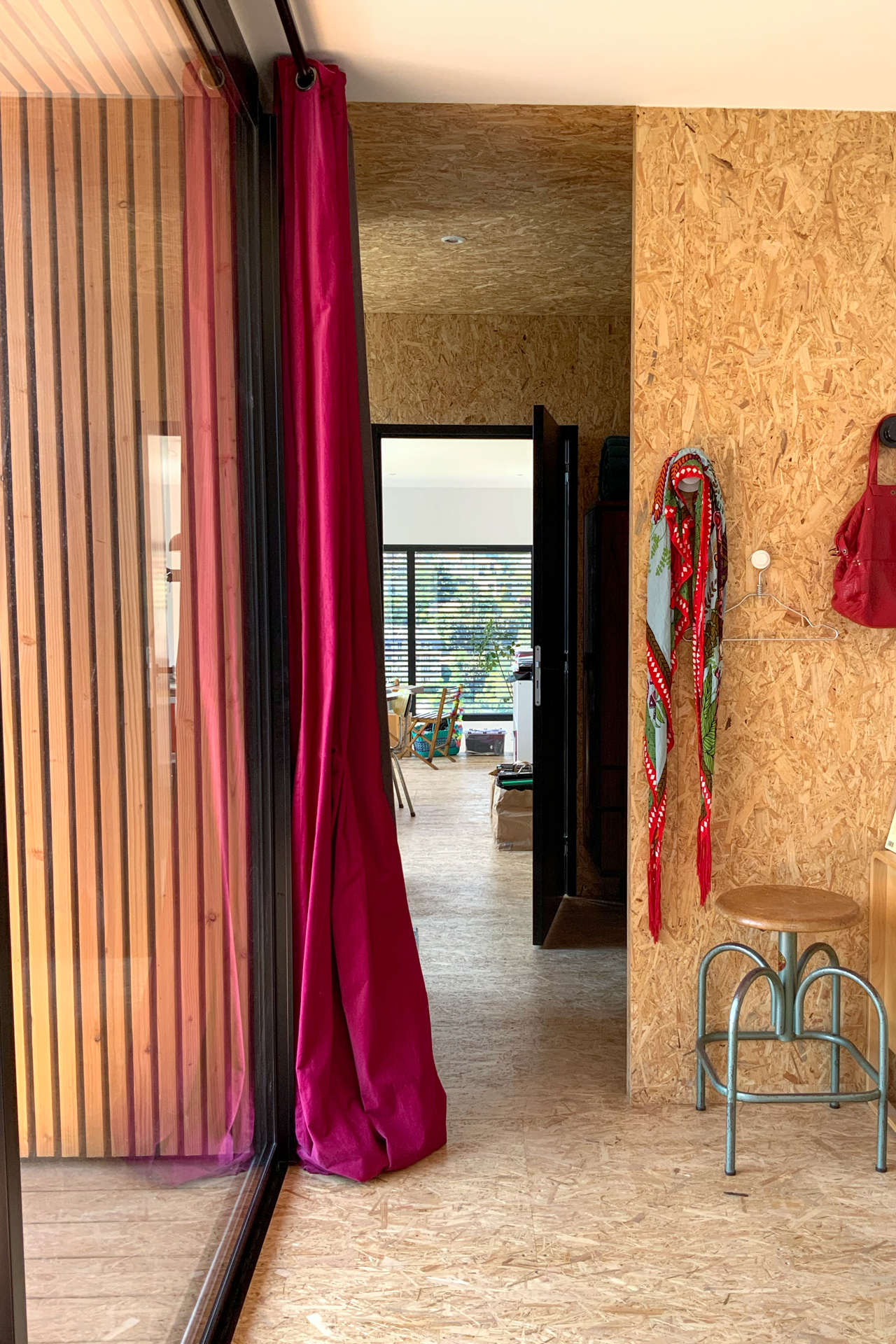 Le projet assume l’emploi de matériaux bruts, choisis pour leur sobriété et leur cohérence budgétaire : cloisons en OSB, sols en béton quartz dans les pièces de vie et planchers en OSB à l’étage. Les façades associent contreplaqué protégées au goudron de pin noir de Norvège et bardage en douglas à claire-voie, renforçant l’intégration naturelle et durable de la maison dans son paysage.