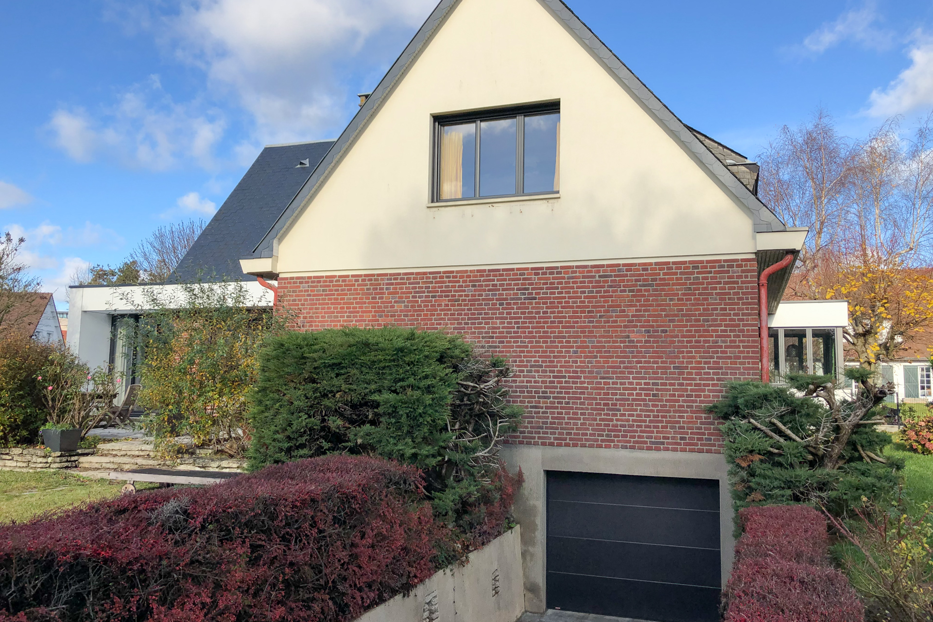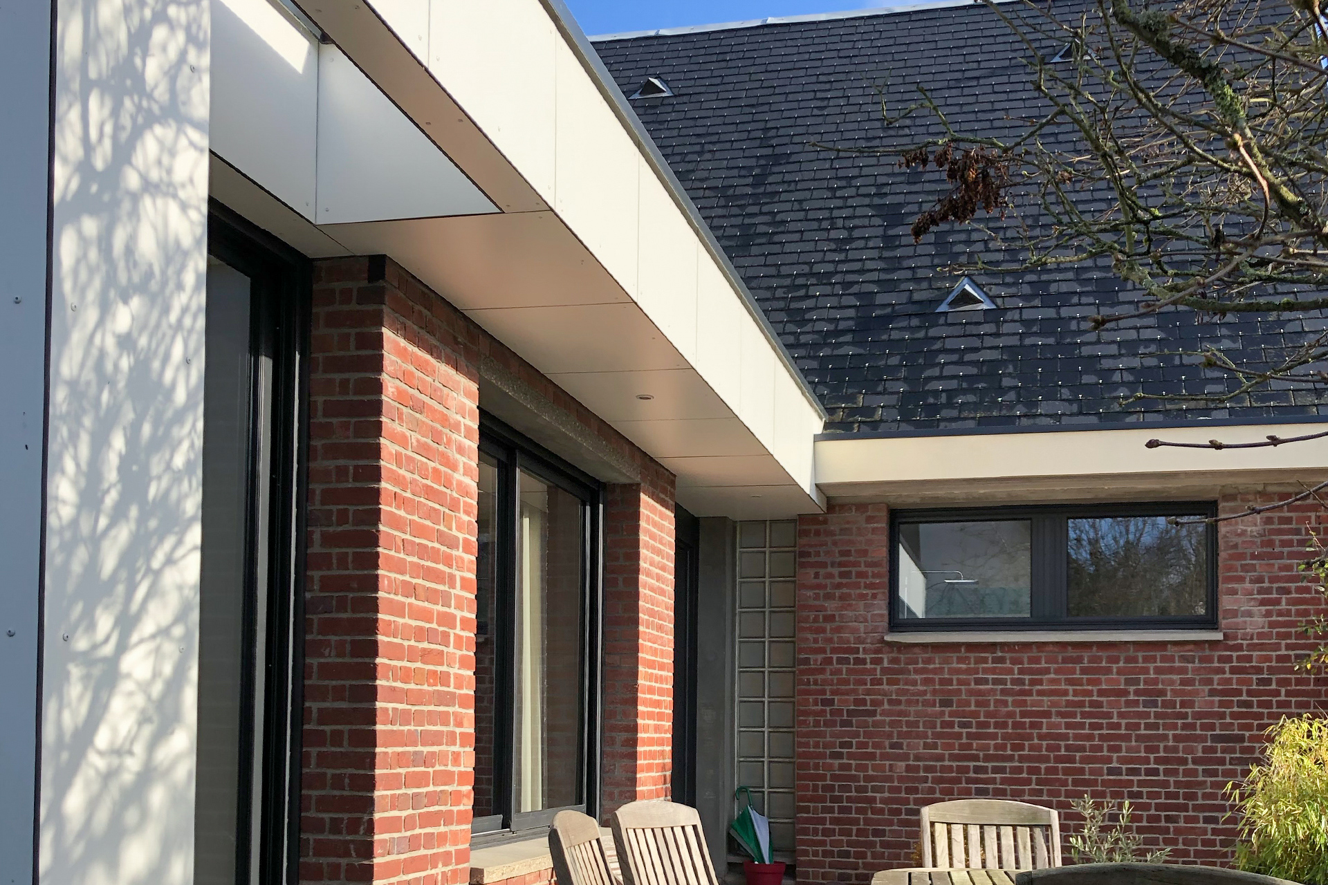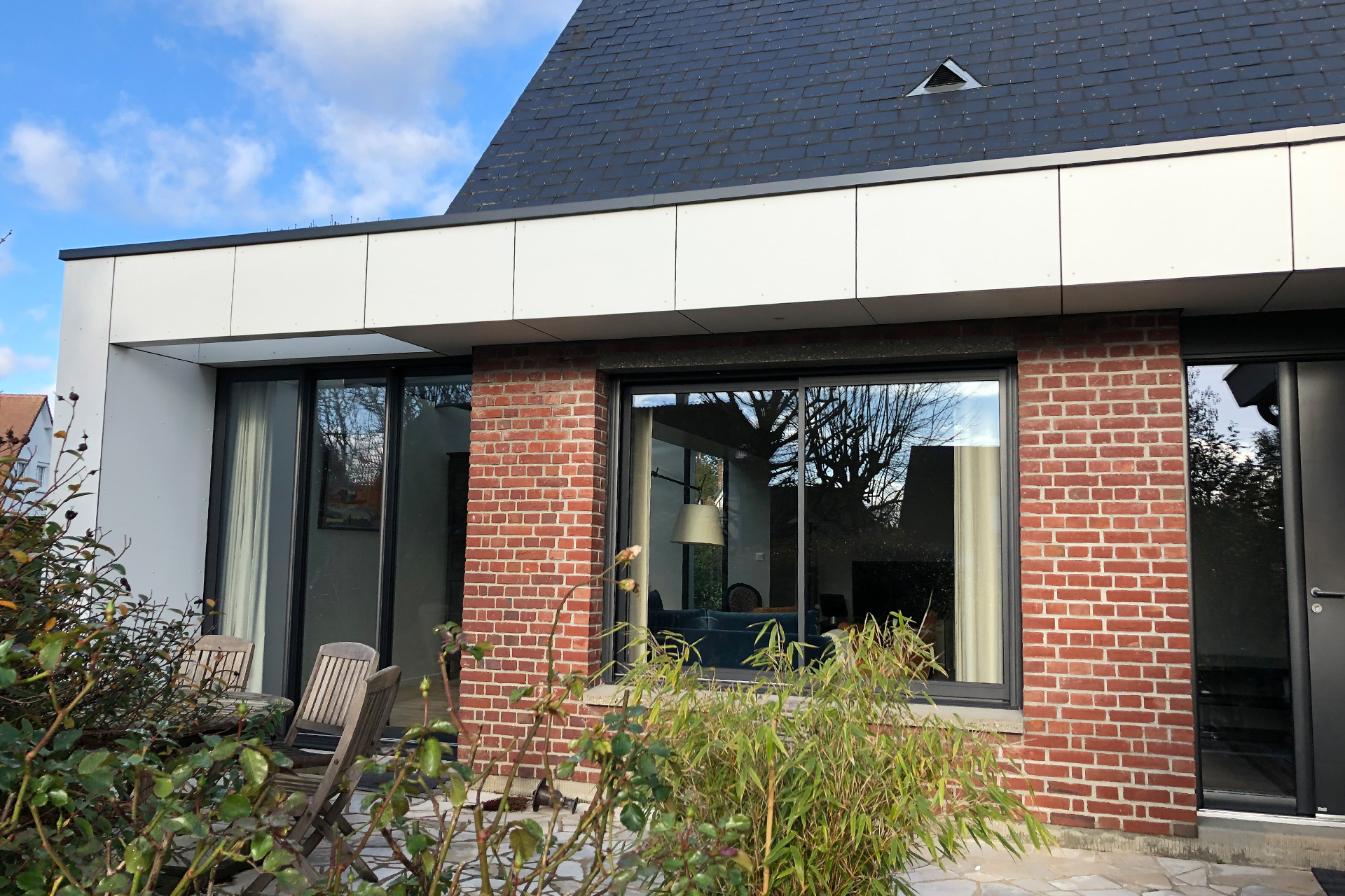 Les interventions modifient l’aspect général de la maison, tout en respectant l’esprit du bâti d’origine. Les façades en briques rouges du rez-de-chaussée et les pignons enduits laissent place, pour les extensions, à un bardage en panneaux composites blancs répondant à la teinte claire de l’existant. Une verrière en toiture sur l’extension du séjour complète l’ensemble, accentuant les apports lumineux naturels.