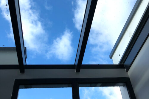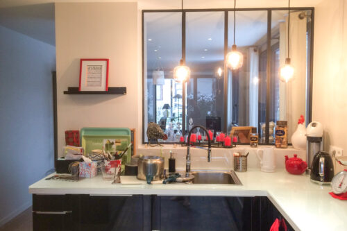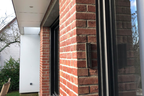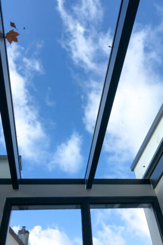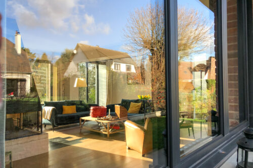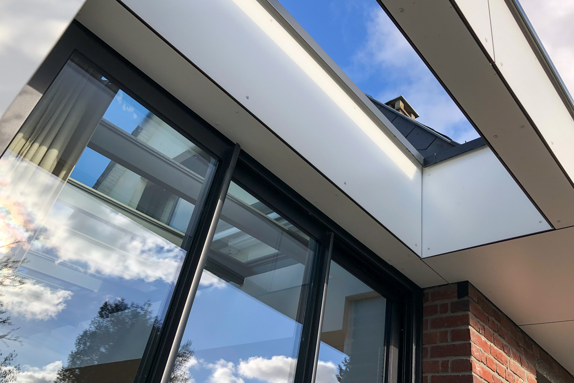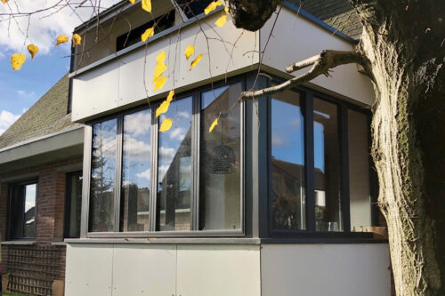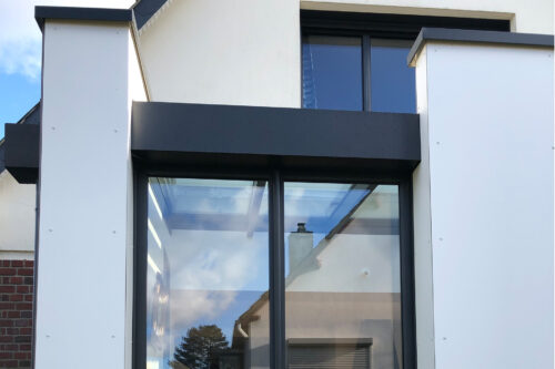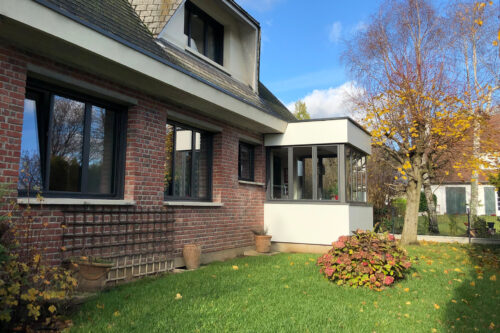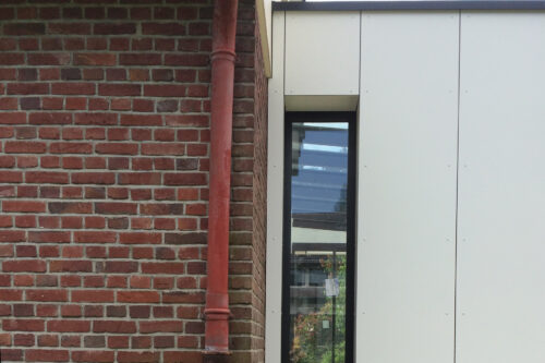 Les interventions modifient l’aspect général de la maison, tout en respectant l’esprit du bâti d’origine. Les façades en briques rouges du rez-de-chaussée et les pignons enduits laissent place, pour les extensions, à un bardage en panneaux composites blancs répondant à la teinte claire de l’existant. Une verrière en toiture sur l’extension du séjour complète l’ensemble, accentuant les apports lumineux naturels.